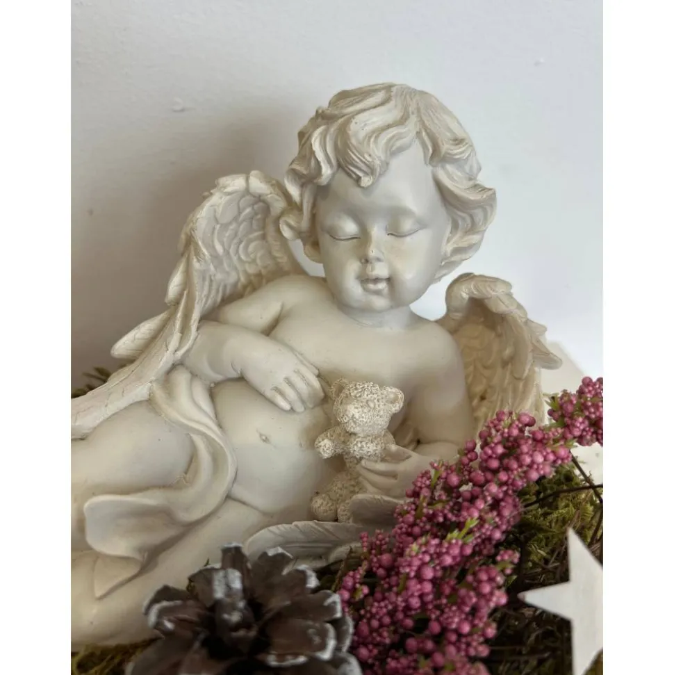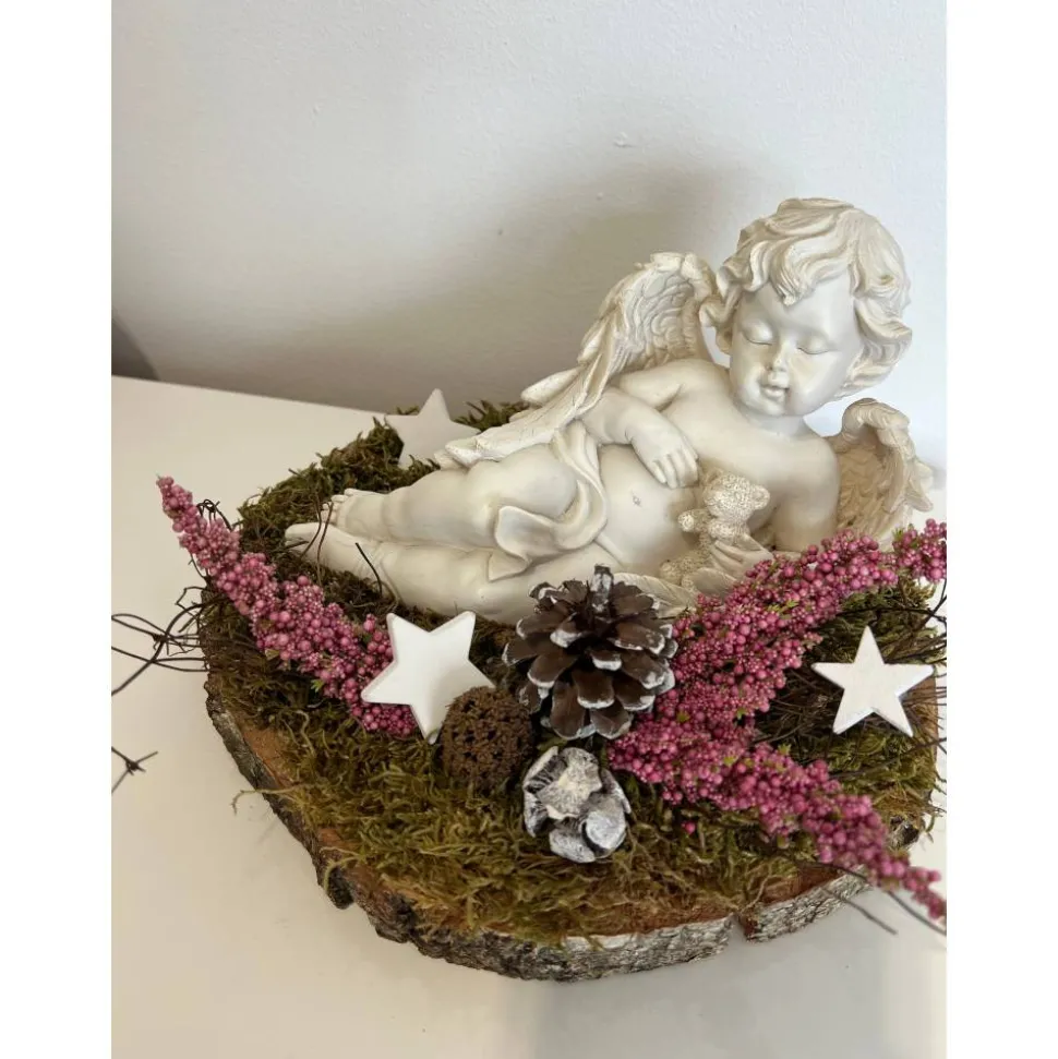 Es besteht aus einem Engel, Sternen, künstlicher Heide, getrockneten Moos und weiteren Naturprodukten.