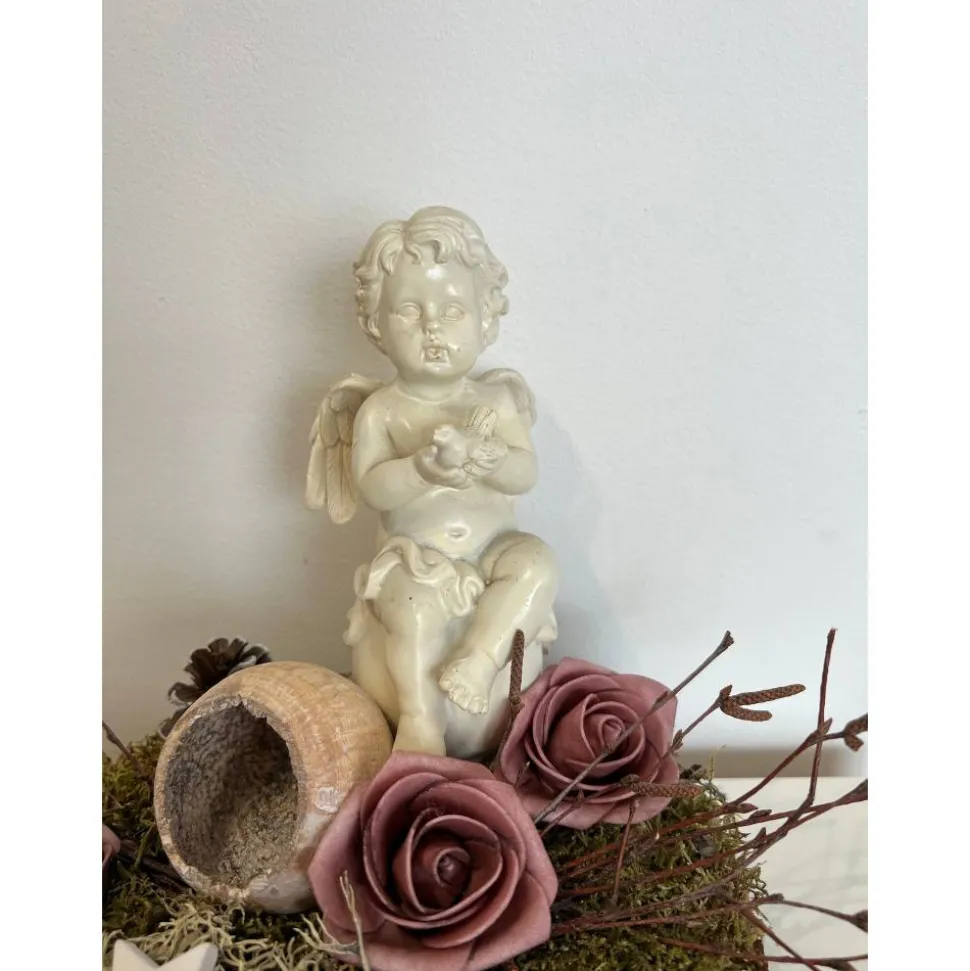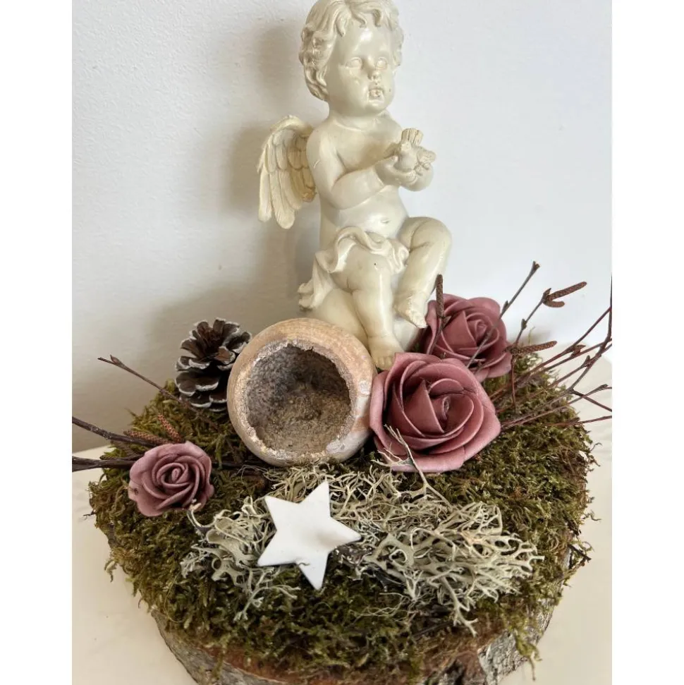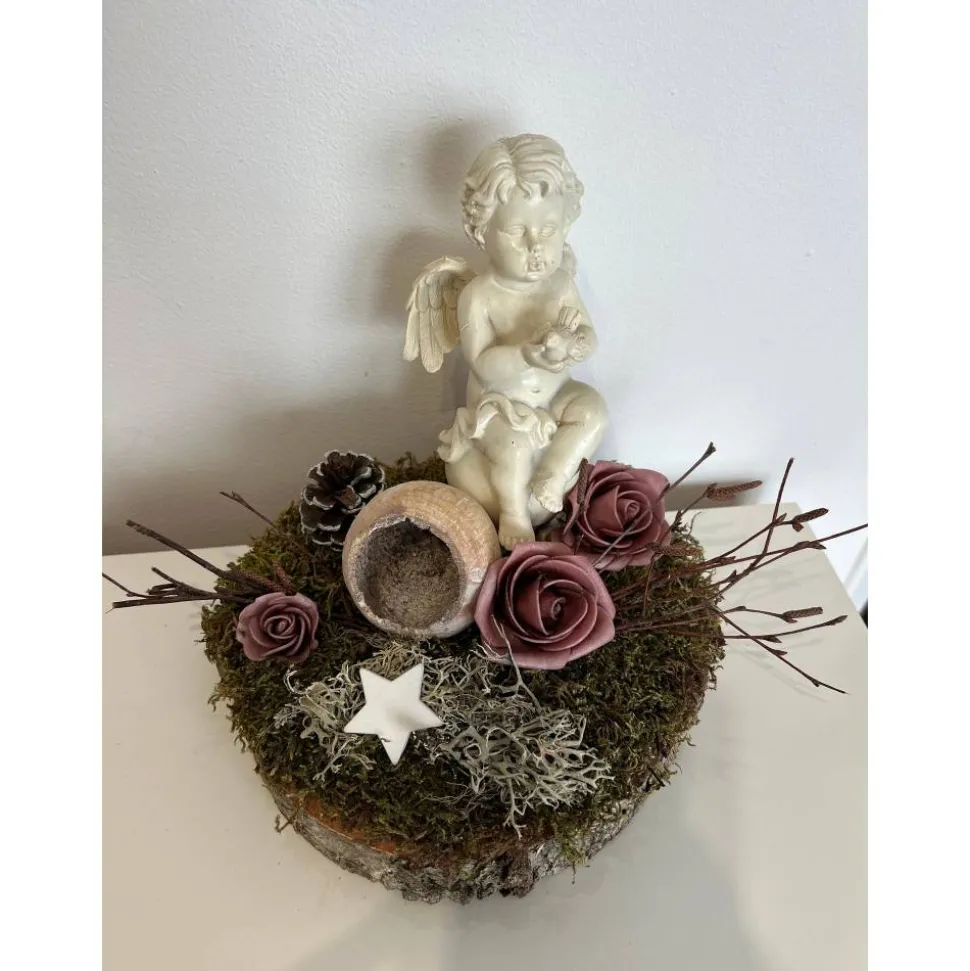 Es besteht aus einem Engel, Blumen, getrockneten Moos und weiteren Naturprodukten.