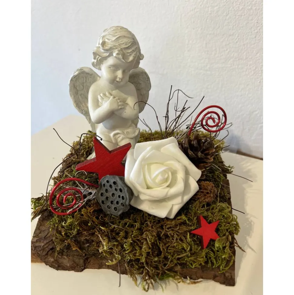 Es besteht aus einem Engel, Schaumstoffrose, getrockneten Moos und weiteren Naturprodukten.
