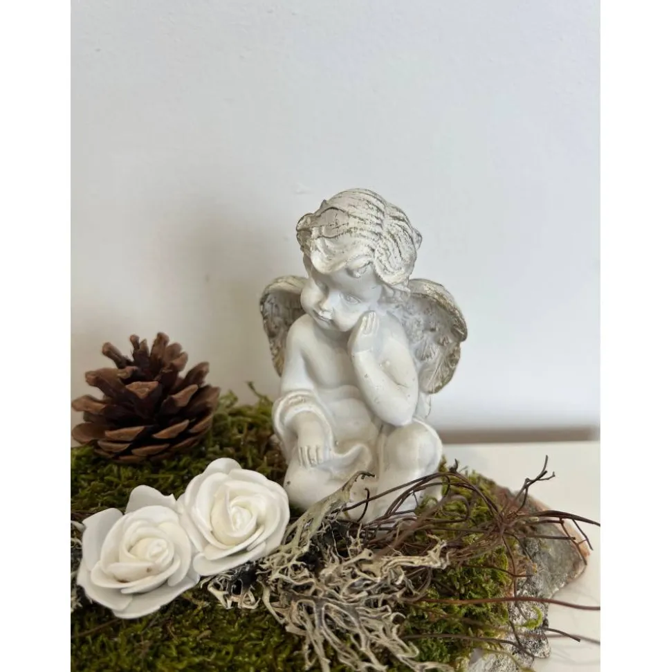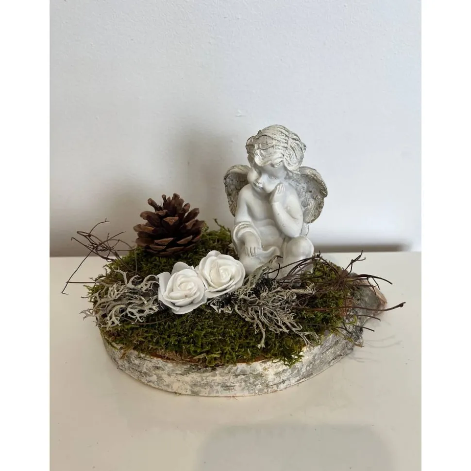 Es besteht aus einem Engel, künstlichen Blumen, getrockneten Moos und weiteren Dekoelementen.