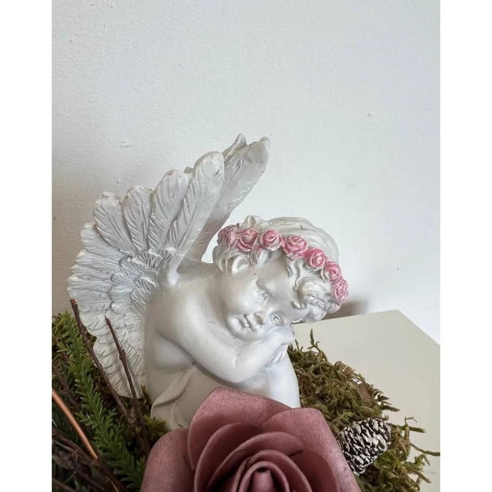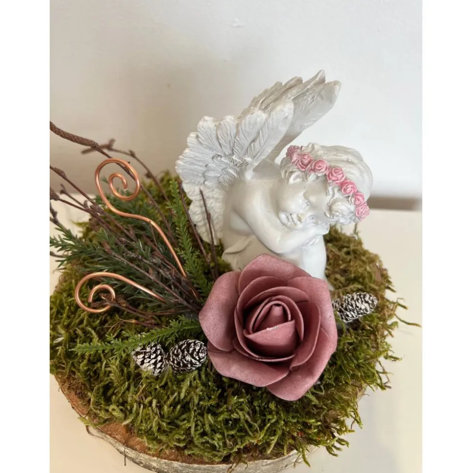 Es besteht aus einem Engel, Blumen, getrockneten Moos und weiteren Naturprodukten.
