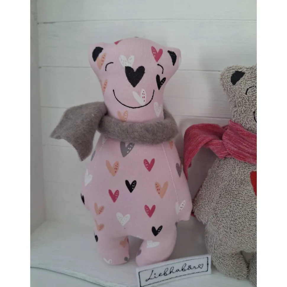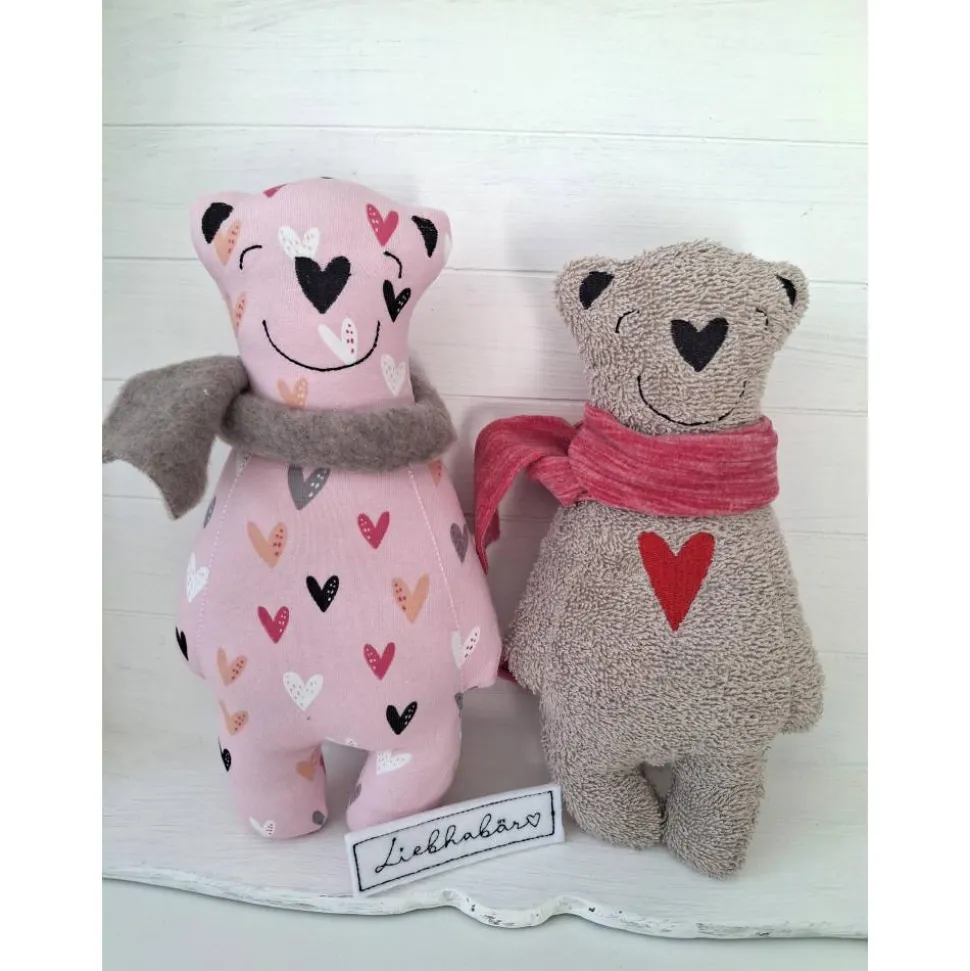 Der größere rosa Bär ist aus Jersey mit goldigen kleinen Herzen und 25 cm groß, der kleinere Bär aus beigem Frottee und ca. 23 cm groß. Beide sind mit Füllwatte gefüllt und kommen natürlich mit einem schmissigen Schal um den Hals und Schild „Liebhabär“. Die Farbe des Schals könnt ihr gerne ändern. Schreibt mir einfach dazu 🙂