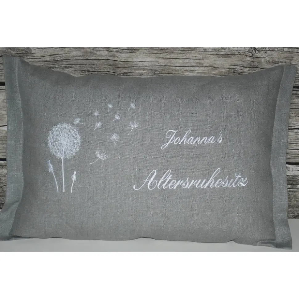Die Kissen werden mit Ihrem Wunschnamen und Pusteblume in Ihrer Wunschfarbe bestickt.
