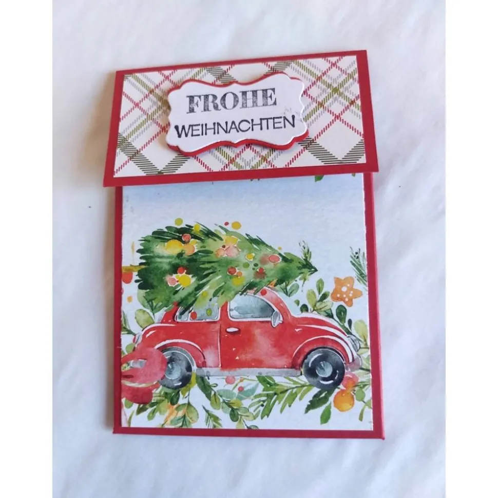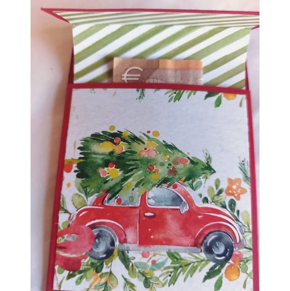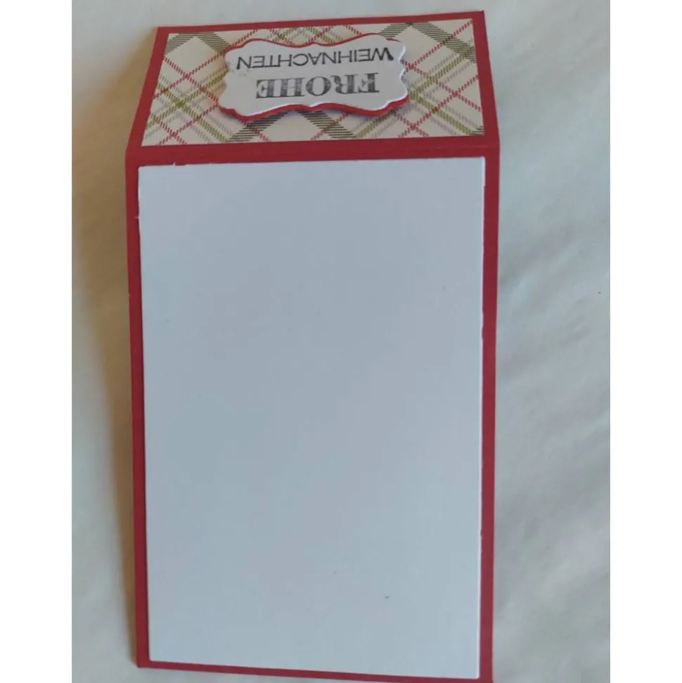 Gefertigt aus rotem Tonkarton und schönem weihnachtlichem Designpapier, hebt man die Klappe an und klappt sie nach oben setzt der Lifteffekt ein und der Geldschein oder der Gutschein konnt zum Vorschein, hinten ist noch Platz um einige persönliche Worte zu schreiben.