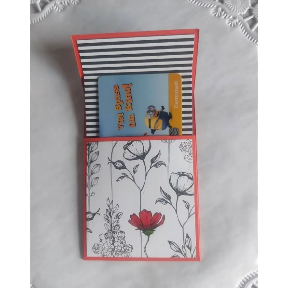 Gefertigt aus rotem Tonkarton und schönem Designpapier, eine Blüte hab ich in rot coleriert. Hebt man die Klappe an und klappt sie nach oben setzt der Lifteffekt ein und der Geldschein oder der Gutschein kommt zum Vorschein, auf der Rückseite ist noch Platz um einige persönliche Worte zu schreiben.
