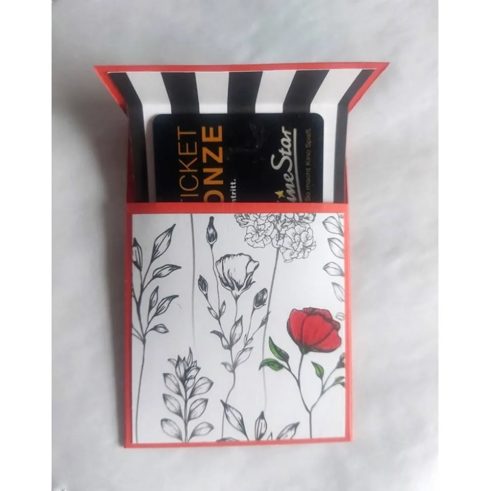 Gefertigt aus rotem Tonkarton und schönem Designpapier, eine Blüte hab ich in rot coleriert. Hebt man die Klappe an und klappt sie nach oben setzt der Lifteffekt ein und der Geldschein oder der Gutschein kommt zum Vorschein, auf der Rückseite ist noch Platz um einige persönliche Worte zu schreiben.