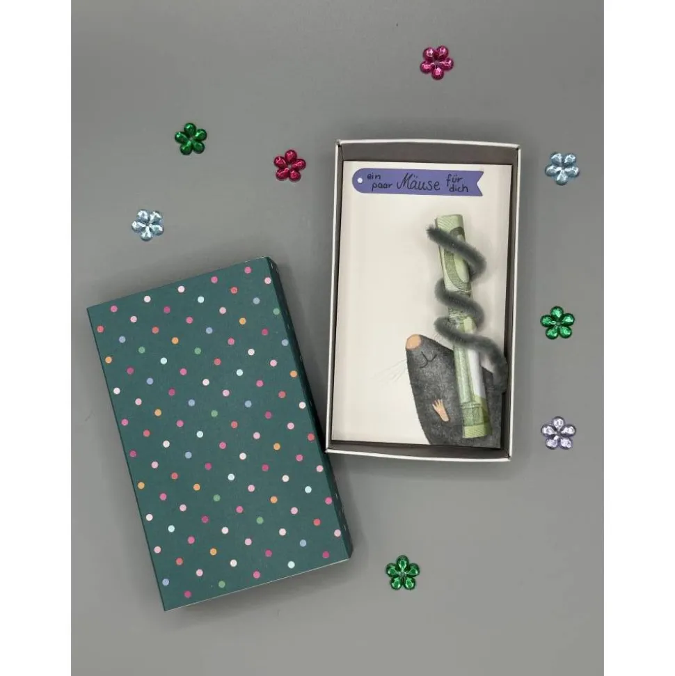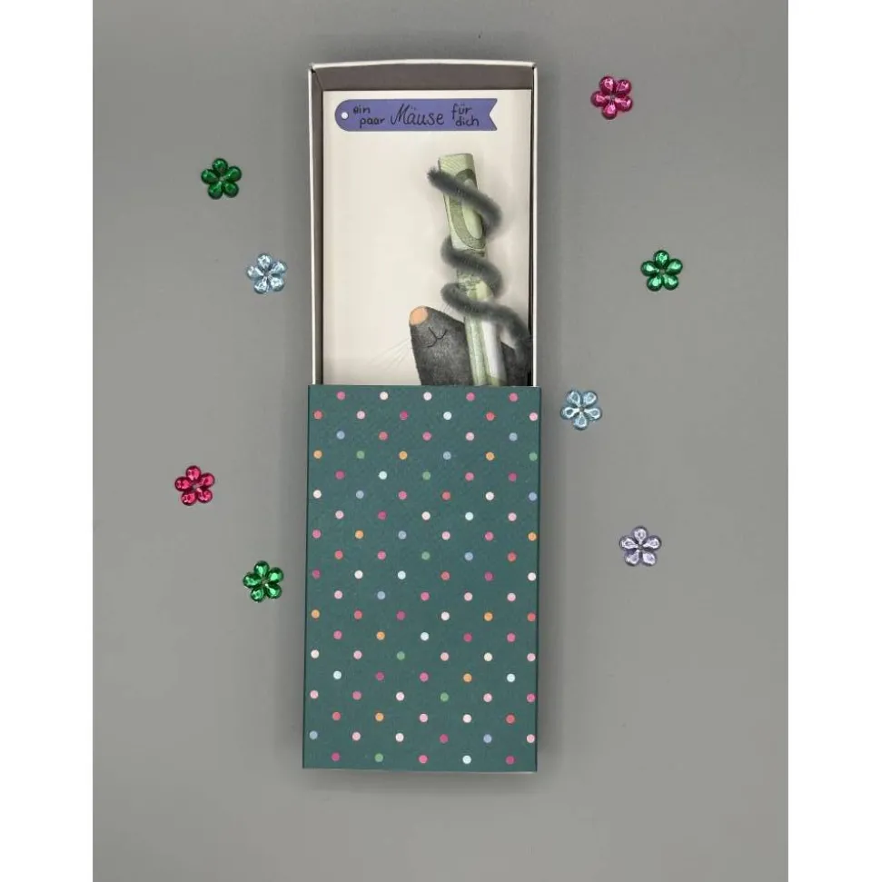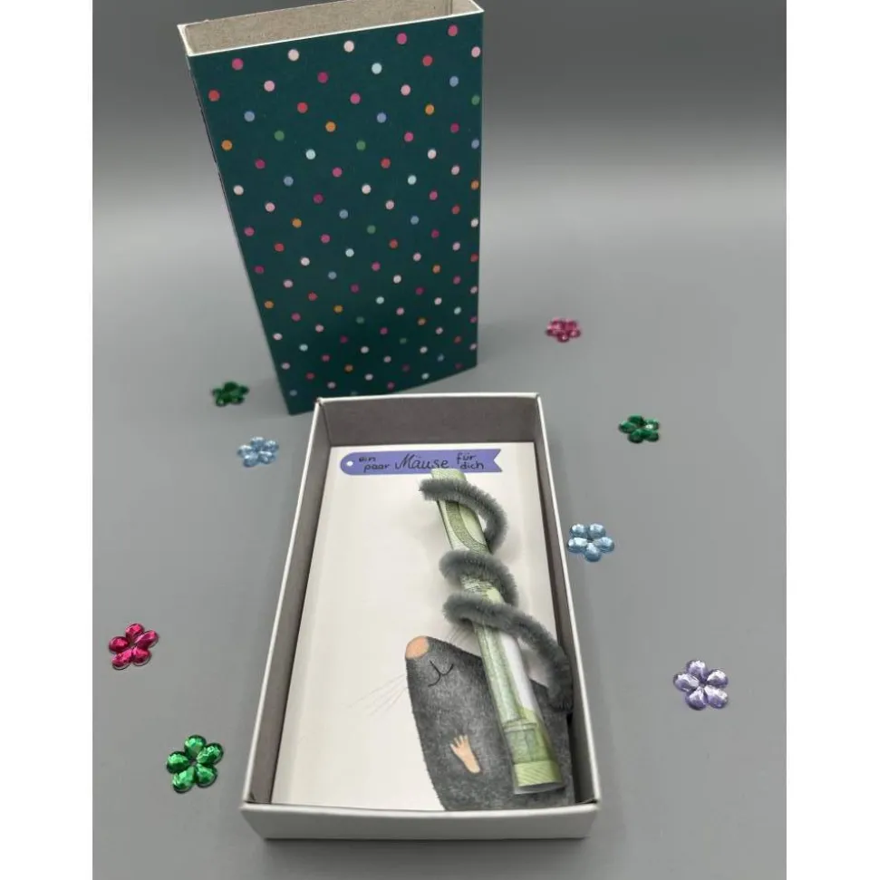 Das Außenteil der Schiebeschachtel ist mit farbenfrohem, gepunktetem Designpapier beklebt. Ein lila Aufkleber mit dem Schriftzug „ein paar Mäuse für dich“ rundet das außergewöhnliche Geschenk ab.
