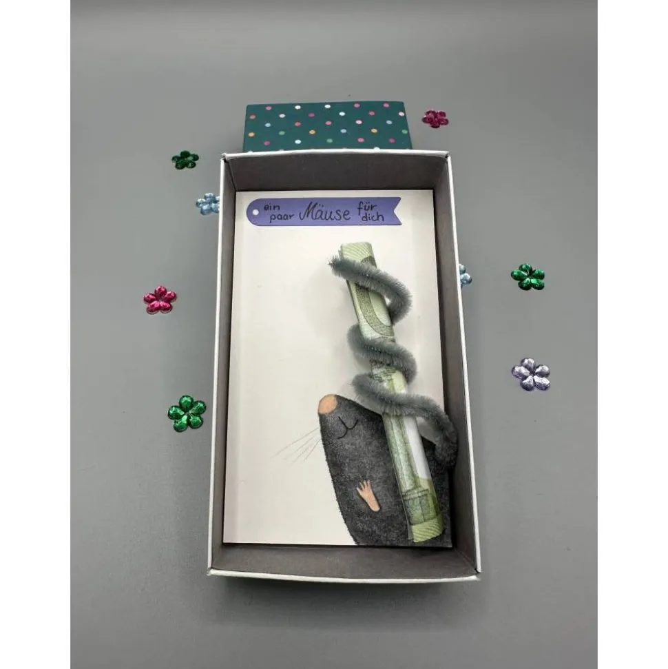 Verschenke Geld mal anders: Mit dem lustigen Geldgeschenk „ein paar Mäuse für dich“ wird jeder Anlass zum Highlight. Statt einfach nur einen Geldschein zu überreichen, steckst du ihn in das graue Mäuseschwänzchen aus Pfeifenputzer, das im Inneren einer liebevoll gestalteten Schiebeschachtel befestigt ist. Die handgemalte Maus blickt dich von unten mit süßer rosa Nase und kleinen Füßchen an – der Geldschein ist raffiniert im Schwänzchen versteckt.