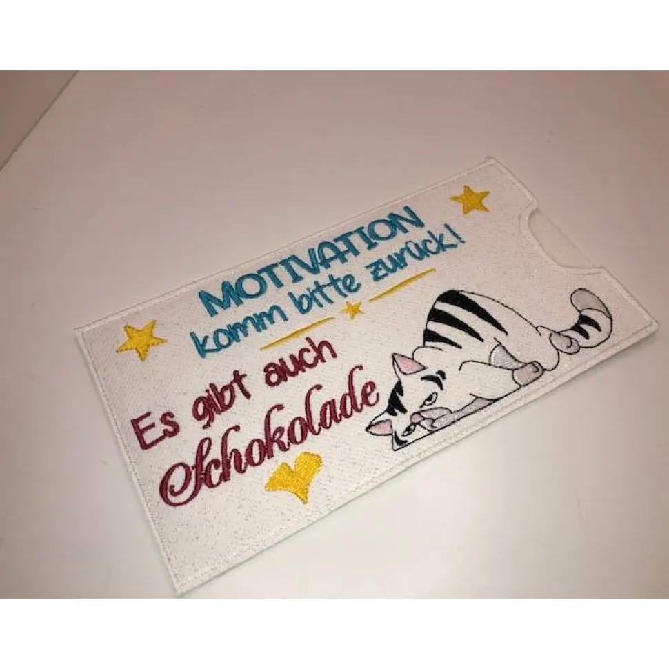 In die gestickte Hülle wird eine Tafel Schokolade gesteckt. (Die Lila Schokolade passt genau rein)