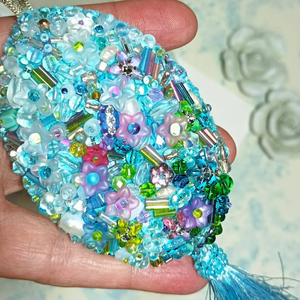 Entdecke ein einzigartiges, mit Liebe handgefertigtes Luxus-Osterei als prachtvollen Wohnschmuck! Dieses handbestickte Prunkei beeindruckt mit aufwändiger Perlenstickerei in zarten Pastelltönen – inspiriert von den Farben der Hortensie. Ein kunstvoller Mix aus Glasblüten in Lila, Bunt, hellem Blau und Flieder funkelt elegant am Osterstrauß oder als festliche Tischdeko.