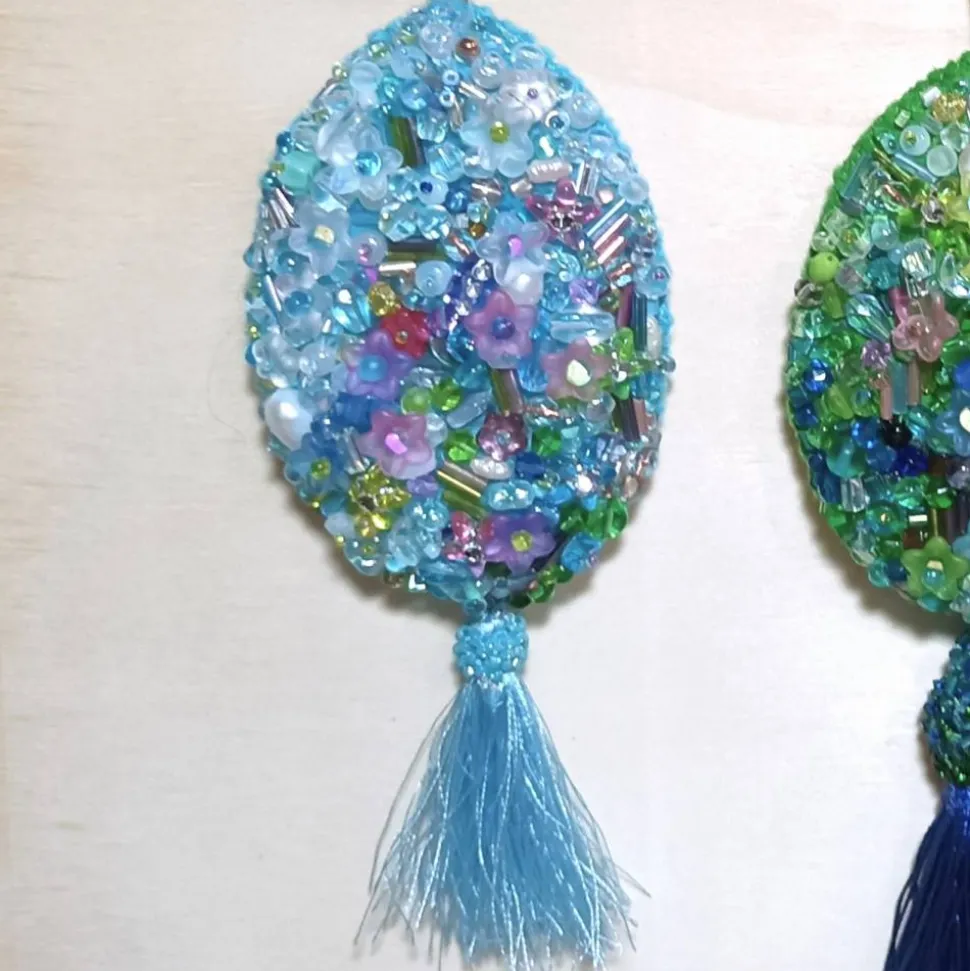 Maße: Höhe ca. 9 cm, Breite ca. 6 cm, Stärke ca. 2 cm durch Füllung & Stickerei. Gesamtlänge mit Satinband ca. 19 cm, Quaste ca. 5 cm. Das abgebildete Osterei in Blau mit üppiger, perlenverzierter Quaste ist genau das Einzelstück, das Du erhältst.