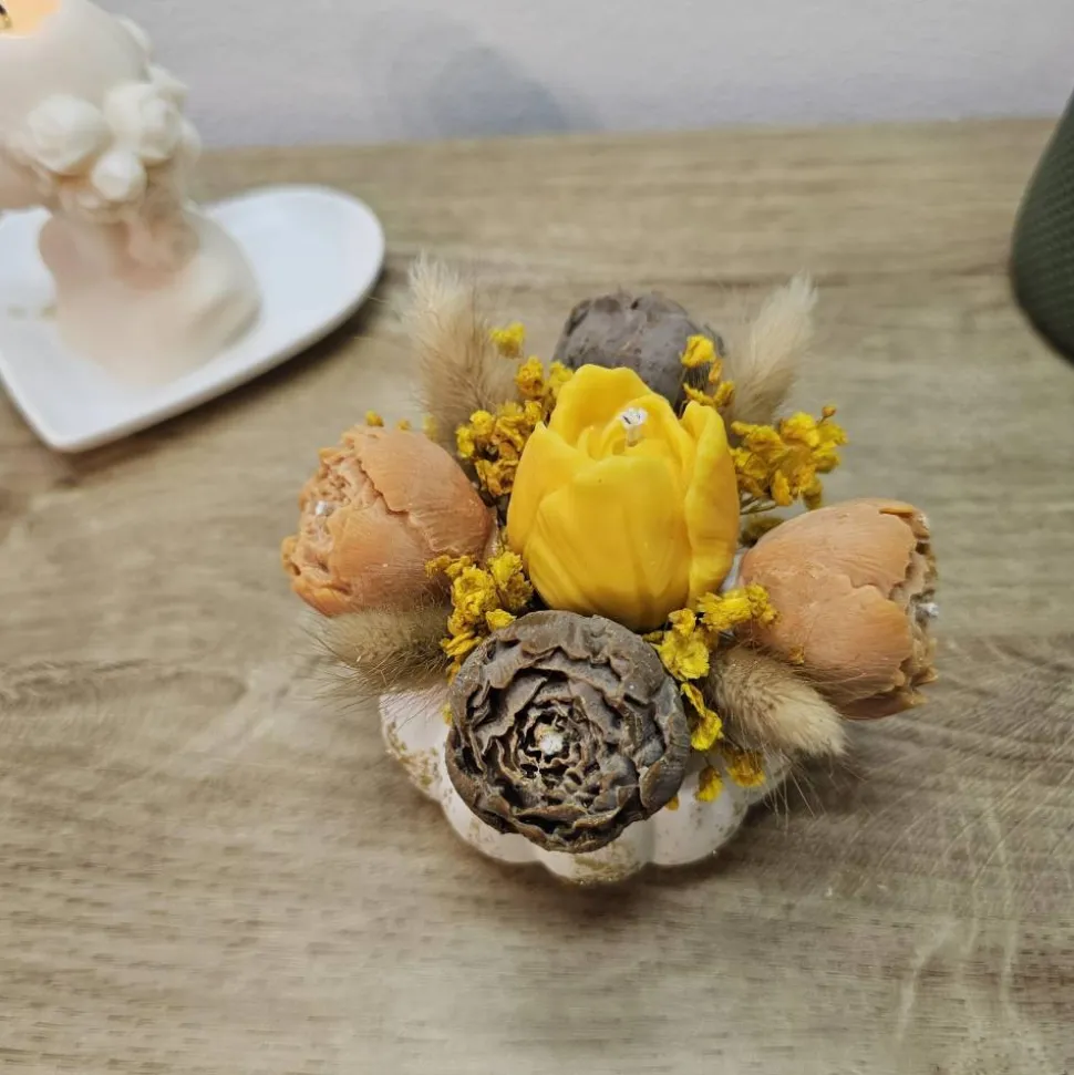 Ich präsentiere eine wunderschöne Komposition aus detailreichen Kerzenblumen (Tulpen & Mohnkapseln) und echten Trockenblumen, arrangiert in einem eleganten, weiß-goldenen Kürbis-Teelichthalter.