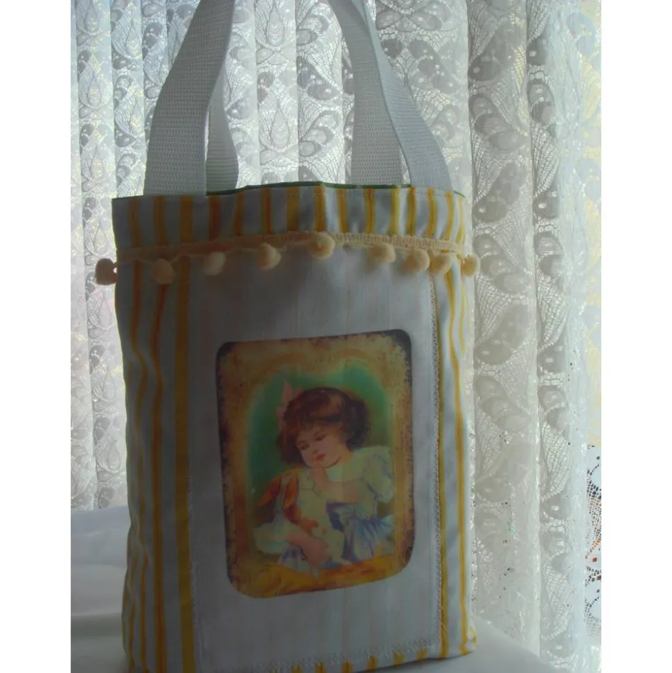 Fester Baumwollstoff,auch als Innenfutter,robuste Griffe aus Gurtband,nicht zu breit für kleine Hände,außen aufgenäht eine Applikation mit Bügelbild.