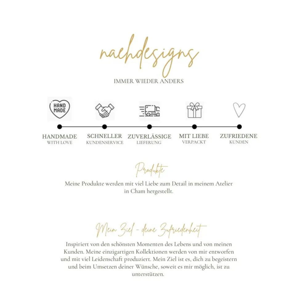 Inspiriert von den schönsten Momenten des Lebens und von meinen Kunden. Meine einzigartigen Kollektionen werden von mir entworfen und mit viel Leidenschaft produziert. Mein Ziel ist es, dich zu begeistern und beim Umsetzen deiner Wünsche soweit es mir möglich ist zu unterstützen. Sonderwünsche aber bitte immer vorab mit mir abklären. Ich versuche diese gern umzusetzen.