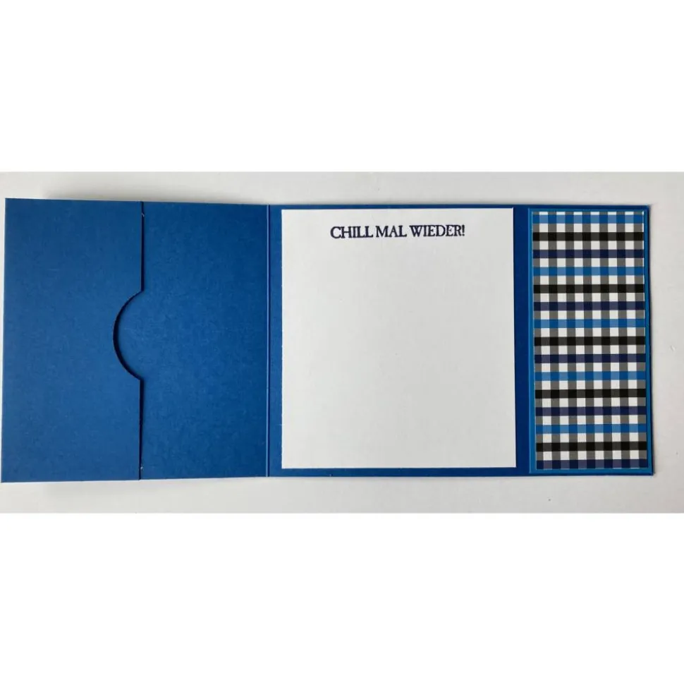 Klappt man die Karte auf, erscheint auf der Innenseite der Karte der Stempelspruch: Chill mal wieder!