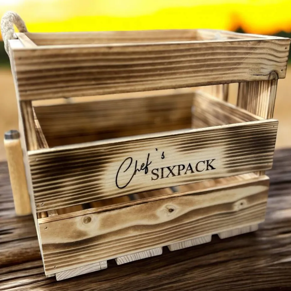 Diese handgefertigte „Männerhandtasche“ ist für 6x 0,33l Bierflaschen konstruiert und aus Konstruktionsvollholz KVH hergestellt. Die Männerhandtasche lässt sich durch das befestigte Seil tragen und ist immer eine große Hilfe. Der mitgelieferte Flaschenöffner ist mit zwei Magneten befestigt und immer griffbereit. Die Gravur „0,33er Schlüssel“ ist Standard und kann auf Wunsch geändert werden.