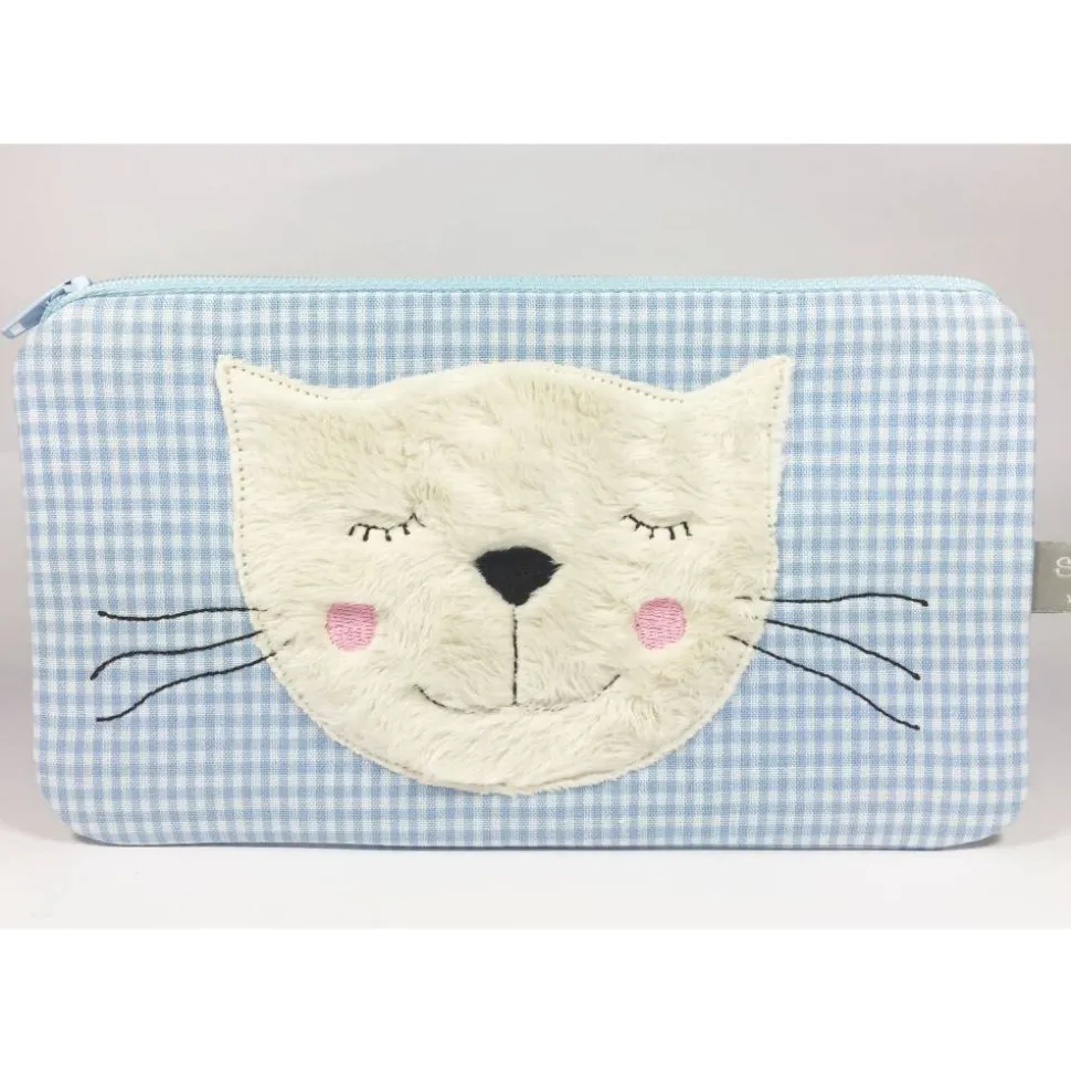 Appliziertes Katzengesicht aus kuscheligem beigem Plüsch auf hellblauem Vichykaro.