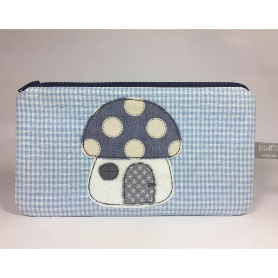 Appliziertes Pilzhäuschen auf hellblauem Vichykaro.