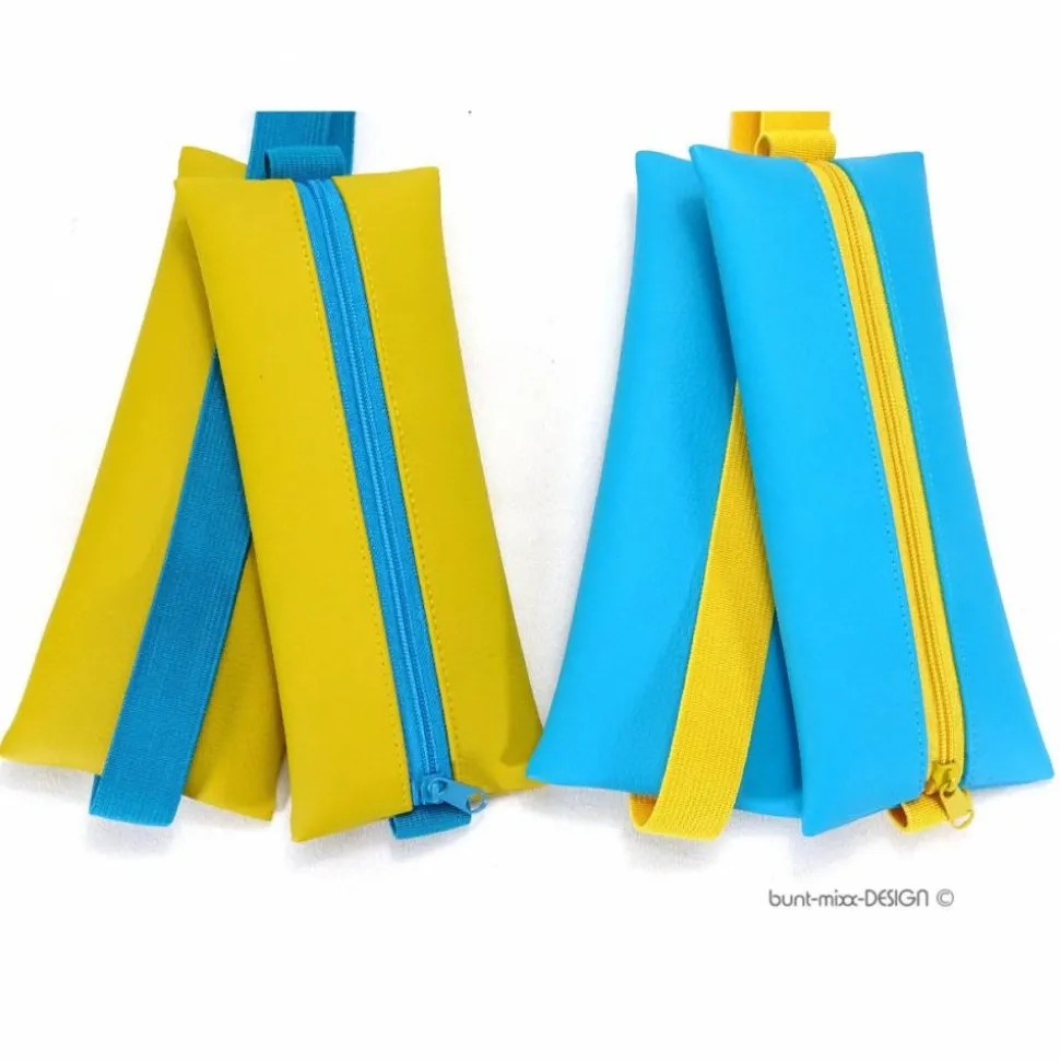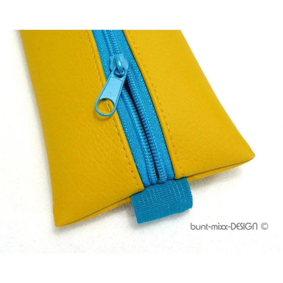 Reißverschluß und Gummiband sind farblich aufeinander abgestimmt: petrol, meergrün, türkis.