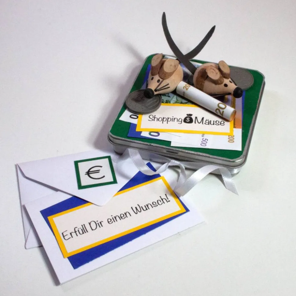 Hübsch gestaltetes Metall Geschenketui für Geldgeschenke und Gutscheine zum Thema: Einkaufen, Shopping, Mäuse, Einkaufsmäuse, Wunscherfüller usw.
