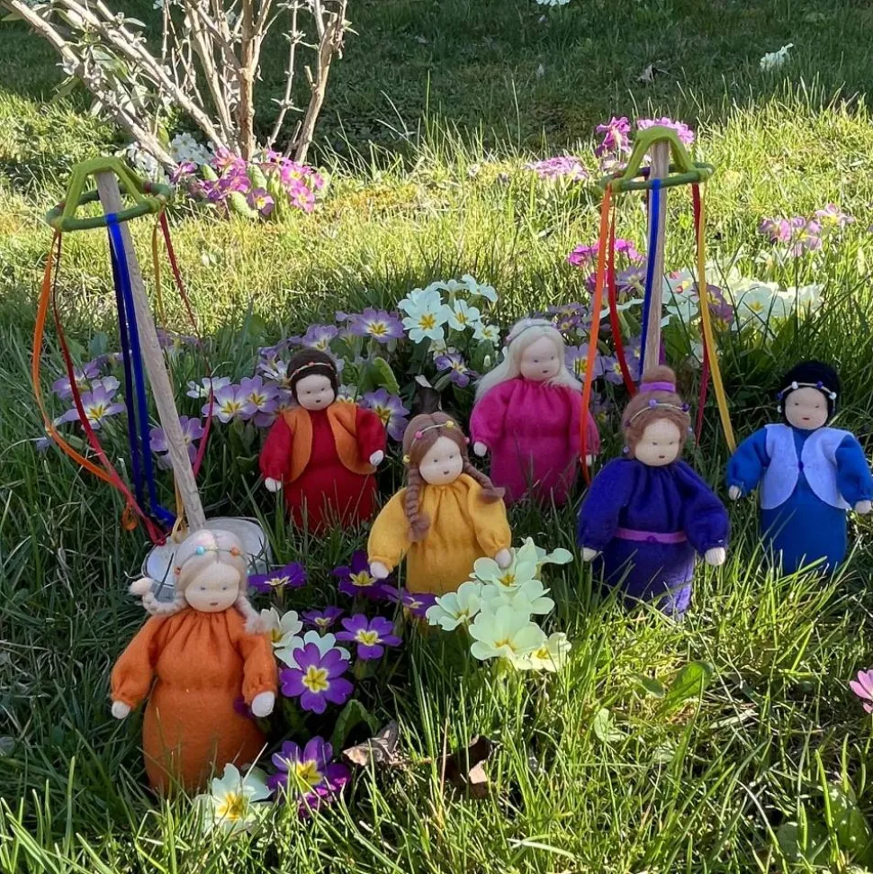 Zu jedem Maibaumreigen-Set gehört 1 Maibaum und 3 Kinder. Es gibt einen roten und einen blauen Junge und ein gelbes, ein oranges, ein lila und ein pinkes Mädchen.