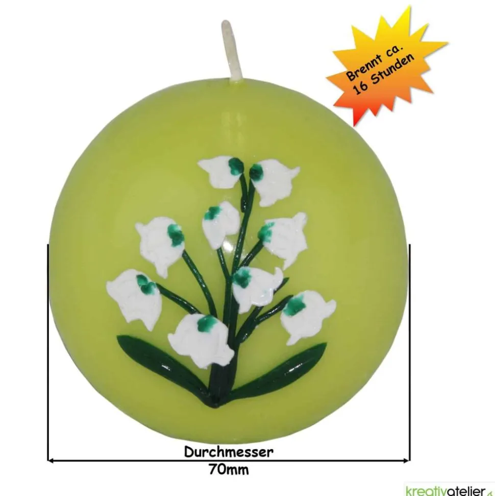 Aufwändig und mit Liebe zum Detail ist diese maigrüne Kugelkerze mit einem kleinen Maiglöckchen verziert. Die weißen Blüten, die wie kleine Glöckchen an der Rispe hängen, bestehen aus Wachs und sind alle unterschiedlich groß. Die fröhliche Kerzenfarbe und die lustige Glockenform der Blüten machen Vorfreude auf den Frühling und sorgen für gute Laune.