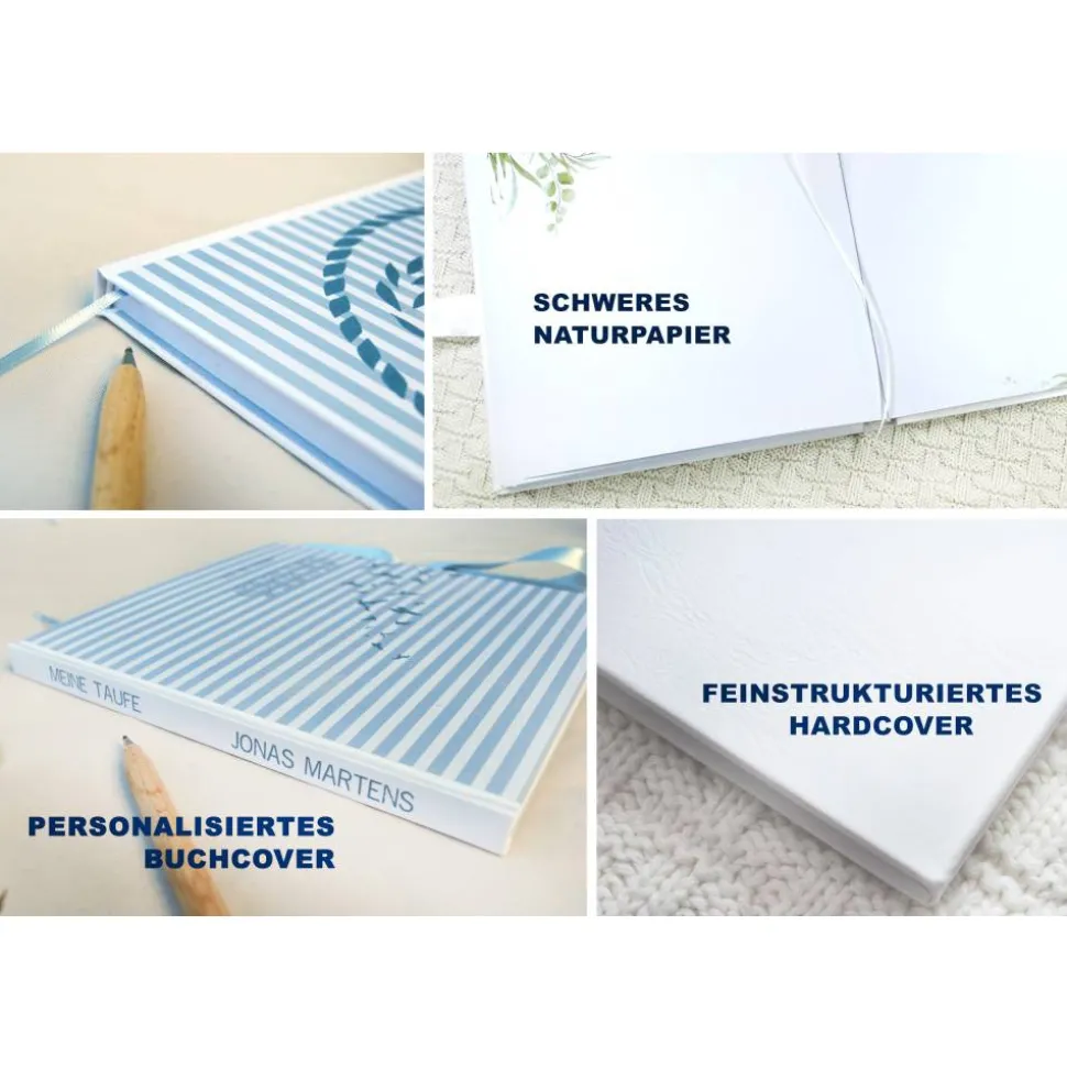 maritimes Gästebuch & Album zur Taufe mit Anker & Tau in Hellblau; personalisiert mit Name; blanko oder mit Fragen blau