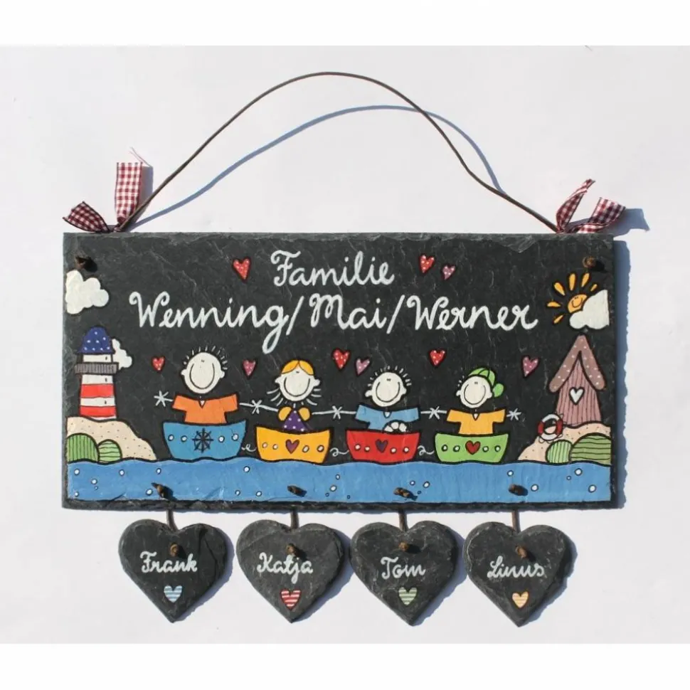 Gestalte deinen Hauseingang mit einem exklusiven, maritimen Haustürschild aus Schiefer – individuell mit Familienname, Wunschtext und Figuren personalisiert!