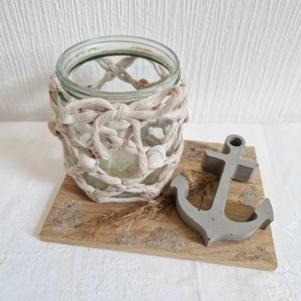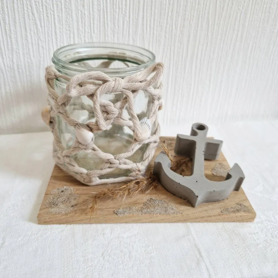 Das besondere Highlight ist der Anker aus Beton, der perfekt mit dem filigranen Makrameemuster und den dekorativen Muscheln harmoniert. Die Holzplatte, auf der etwas Ostseesand geklebt ist, verstärkt das maritime Gefühl und macht dieses Windlicht zum idealen Accessoire für alle, die den Küstenstil lieben.