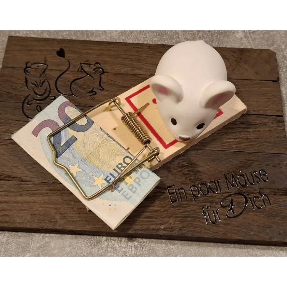 Verschenke Geldscheine auf kreative Art: Mit dieser Mausefalle mit Maus wird dein Geldgeschenk zum echten Hingucker. Die Mausefalle ist fest auf einem Untergrund aus Holzklötzchen montiert und besitzt keinen Auslöser, sodass die Anwendung sicher ist. Einfach deinen Geldschein oder den Gutschein falten und unter die Federklammer legen – sie hält das Geld sicher fest.