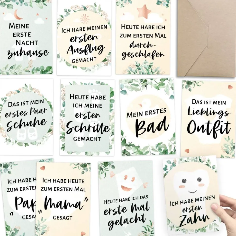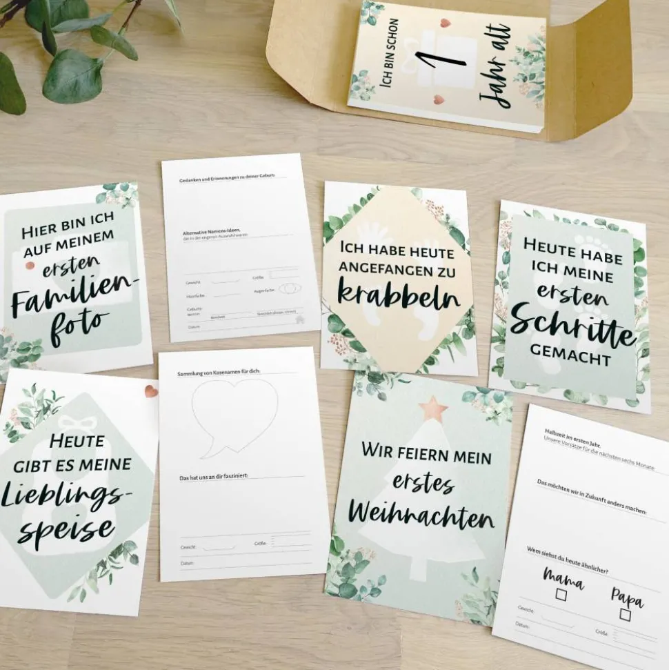 Die Motive der Meilensteinkarten in Eucalyptus- / Greenery-Optik: