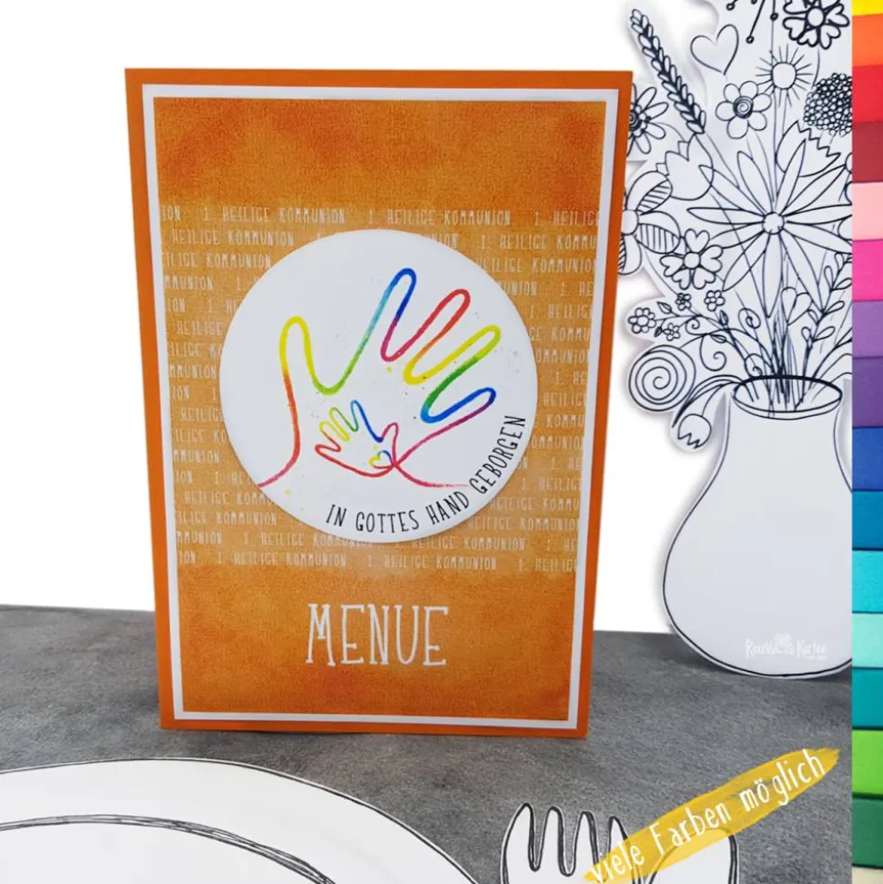 Menükarte Kommunion „In Gottes Hand geborgen“ – individuell & farbenfroh