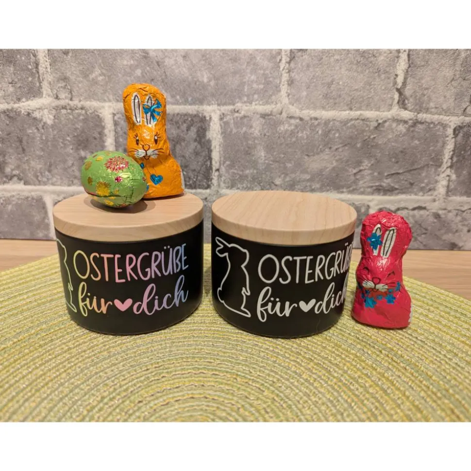 Die Dose ist mit verschiedenen Ostergrüßen und niedlichen Hasenmotiven gestaltet und in weiß oder regenbogenfarben erhältlich – ideal für eine fröhliche Osterüberraschung.