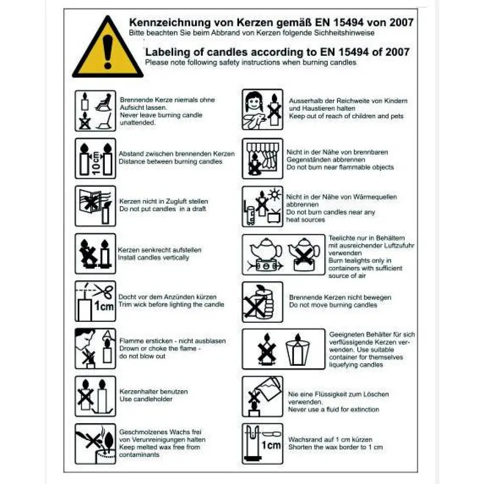 – Aufsicht: Lassen Sie brennende Kerzen niemals unbeaufsichtigt. Halten Sie sie außerhalb der Reichweite von Kindern und Haustieren.