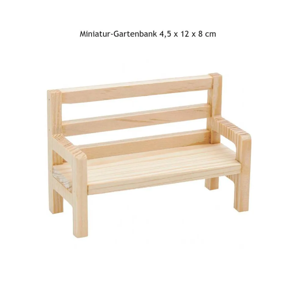 Mit einer Größe von 4,5 x 12 x 8 cm passt die Miniatur Bank perfekt in jede kleine Szenerie und lädt dazu ein, kleine Geschichten und Abenteuer rund um sie herum zu gestalten. Die Mini Gartenbank ist ideal für die Gestaltung einer Wichtelwelt.
