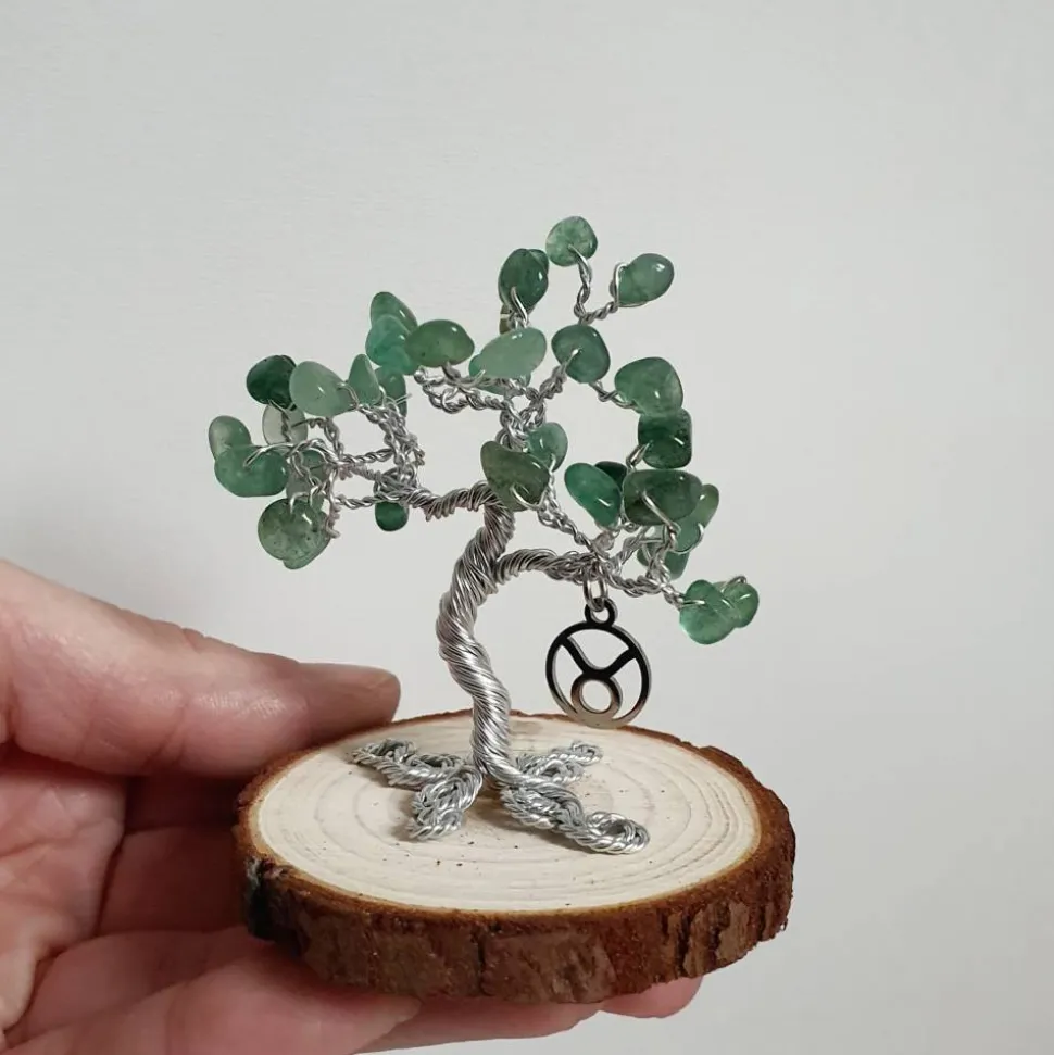 Dieser Mini Glücksbaum wird in sorgfältiger Handarbeit gefertigt. Der filigrane Stamm entsteht aus silberfarbenem Aluminiumdraht. Die Krone besteht aus ausgewählten Edelstein Splittern. Ergänzt wird der Baum durch einen kleinen Sternzeichen-Anhänger, der ihm seine persönliche Bedeutung gibt.