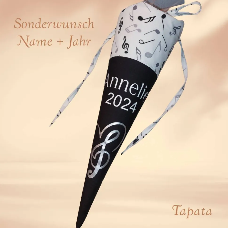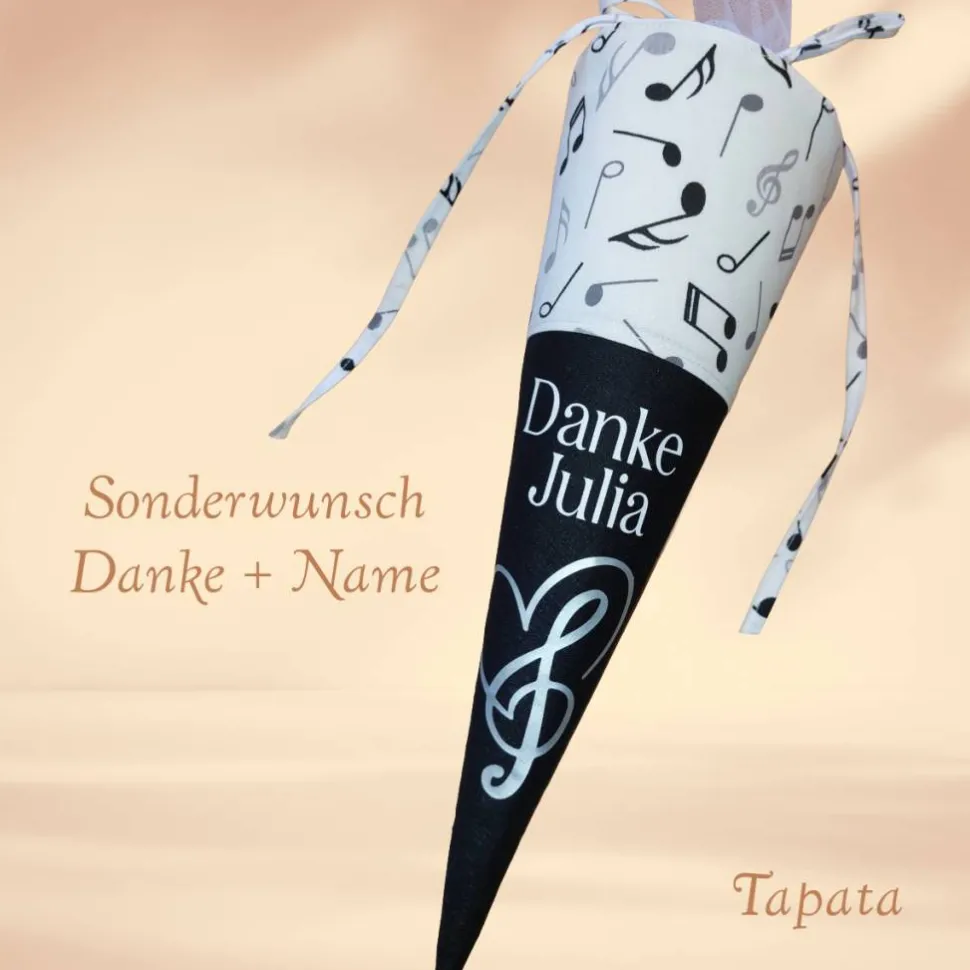 ➡ Namenswunsch: Auf Wunsch kann die Schultüte mit dem Namen oder einen Titel (z.B. Musiklehrer) versehen werden. Bitte geben Sie in das Feld Personalisierungswünsche den Wunschtext ein. Max. 20 Zeichen. Je nach Länge wird die Schriftgröße angepasst.