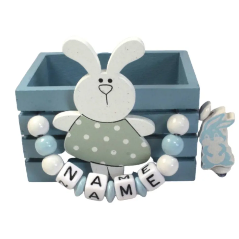 Material Namensanhänger: PP Kordel, weiße Kunststoffbuchstaben (10 mm oder 6 mm), Holzlinsen, Holzperlen, Perlen , Osterhasenmotiv aus Holz