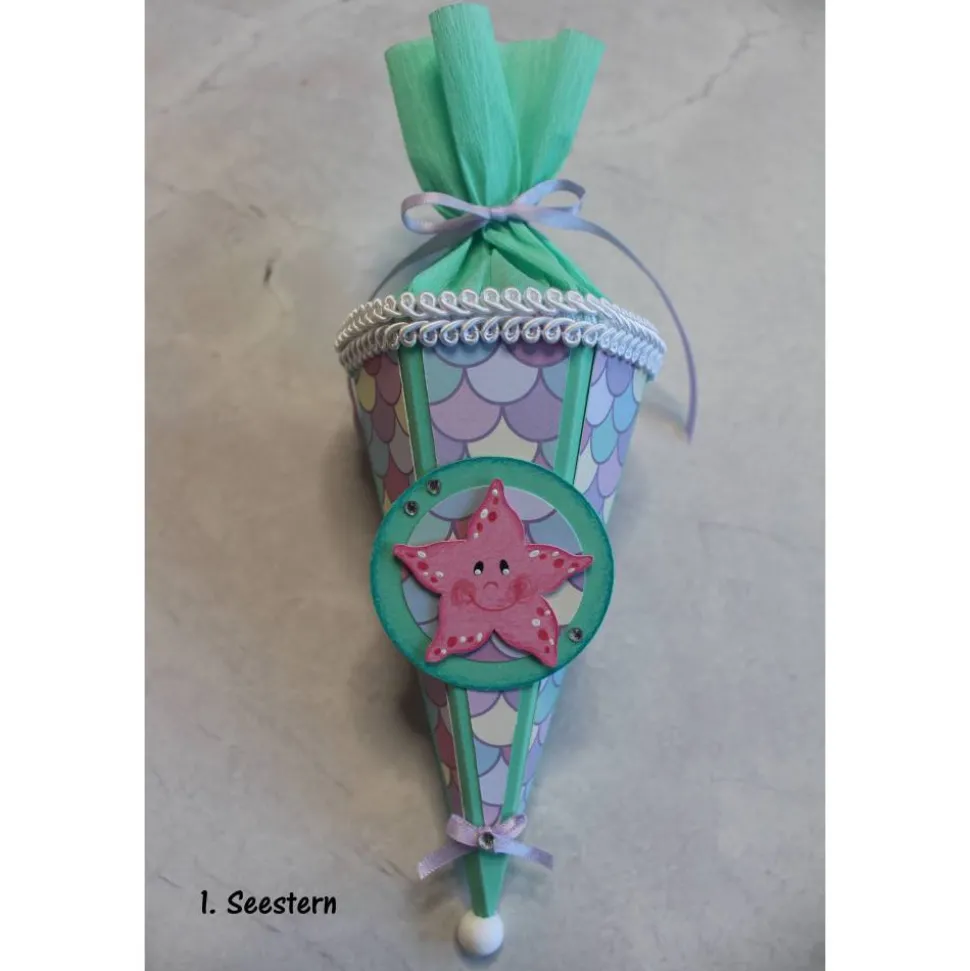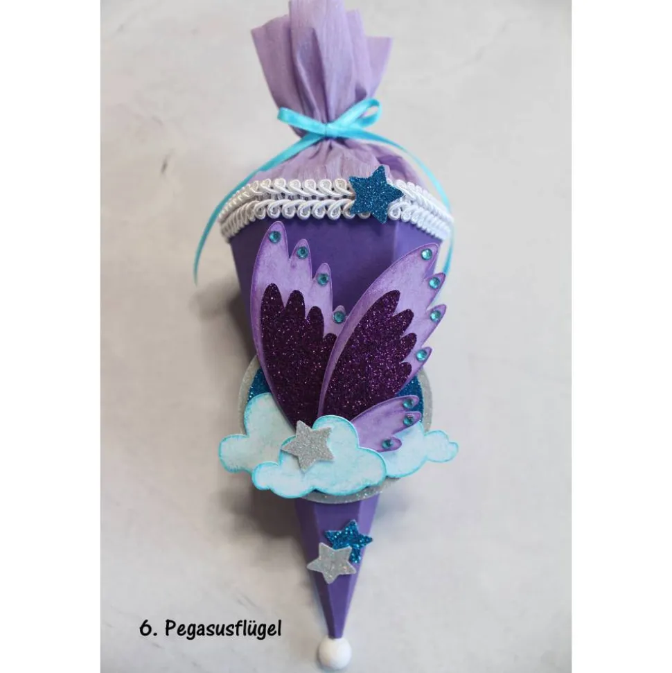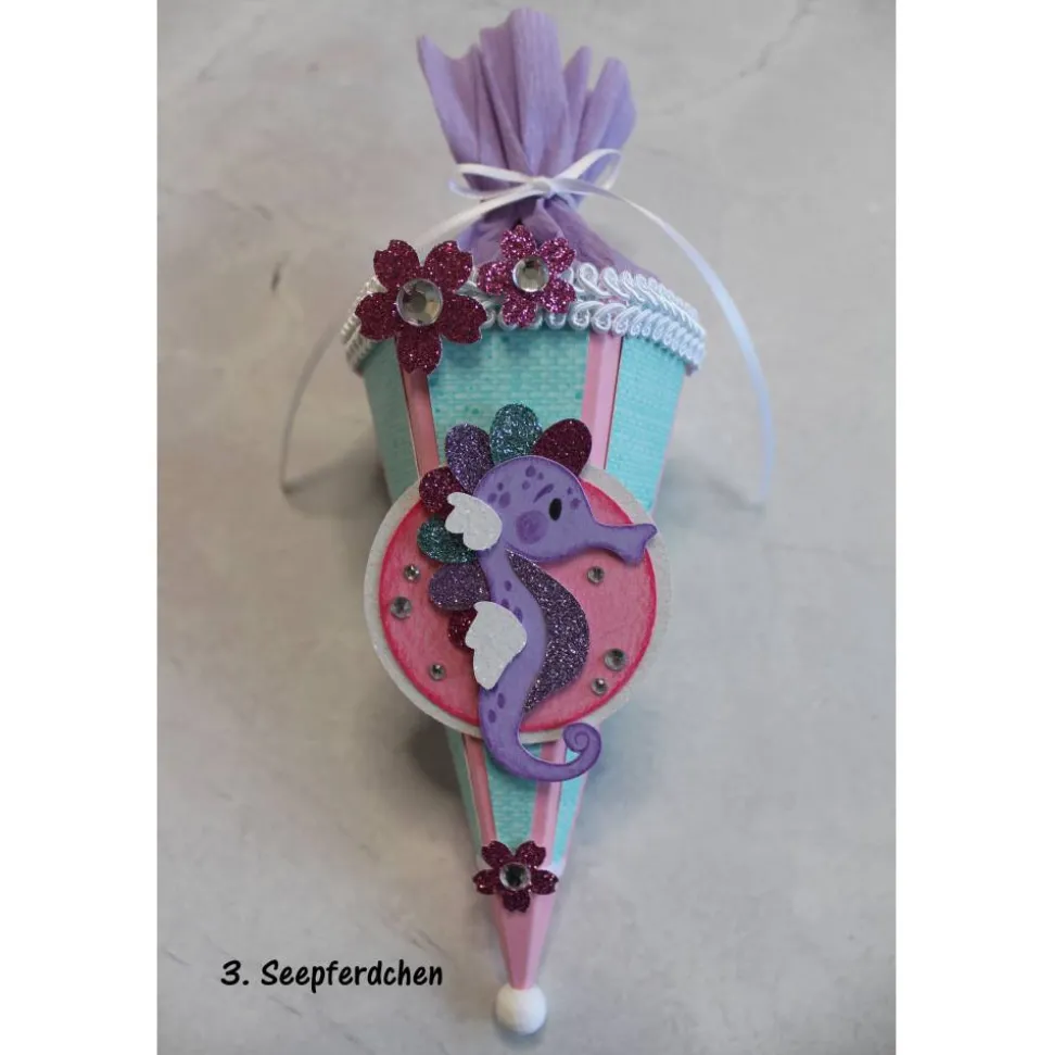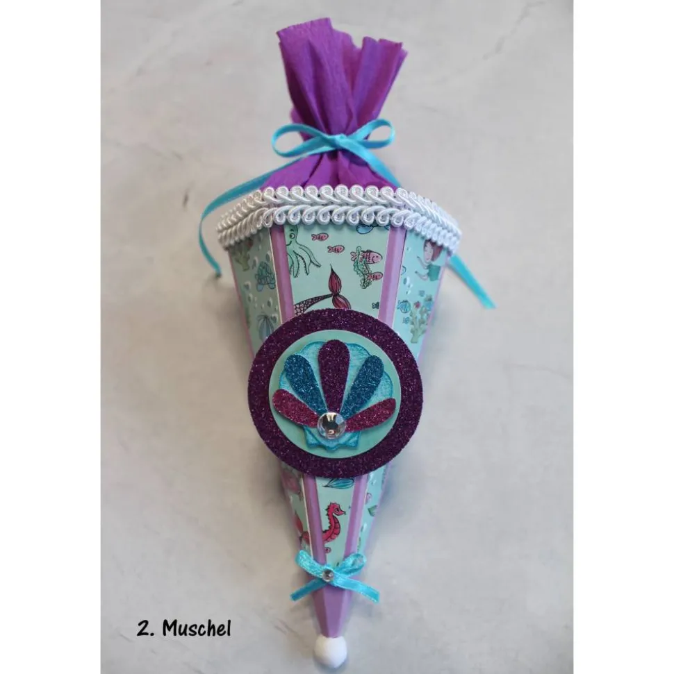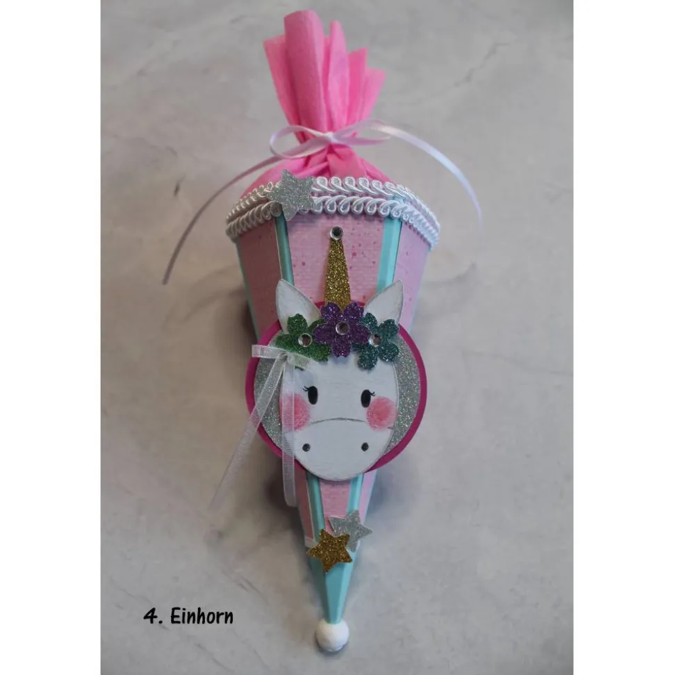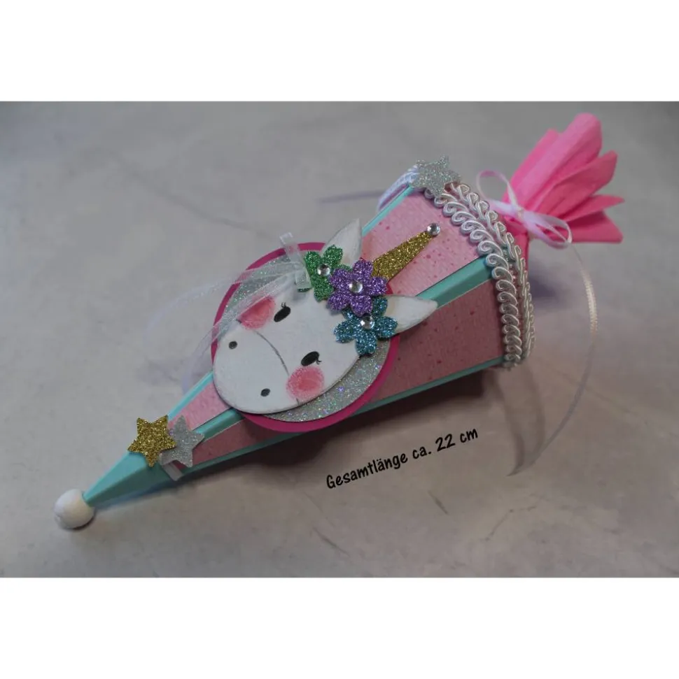 Je nach Bestand können kleine Details wie Schleifenband, Schmucksteine, Krepppapier usw. in Art und Farbe variieren, aber immer passend zur Mini-Schultüte.