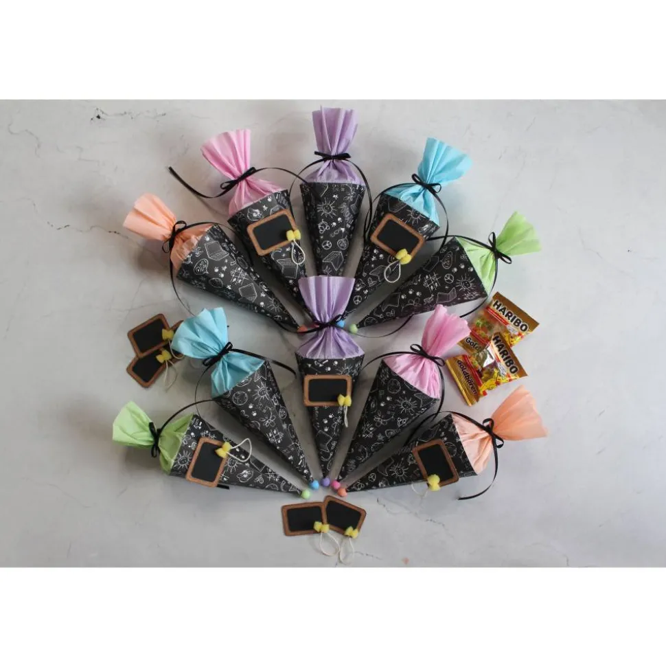 Die Mini-Schultüte ist einzeln oder als 10er Set, mit 5 farblich unterschiedlichen Krepppapiermanschetten, erhältlich.