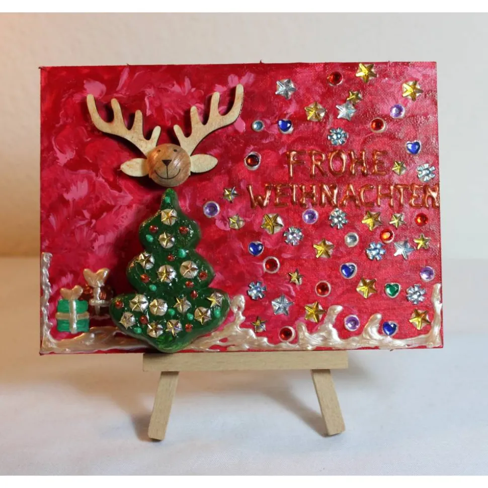 Minibild FROHE WEIHNACHTEN, kleine Collage Weihnachtsdeko mit Rentierkopf aus Holz, nette Tischdeko oder Gastgeschenk