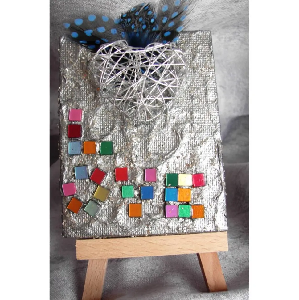 Acrylfarbe auf einem Minikeilrahmen (ca. 7 cm x 9 cm), inklusive passender Ministaffelei aus Holz.