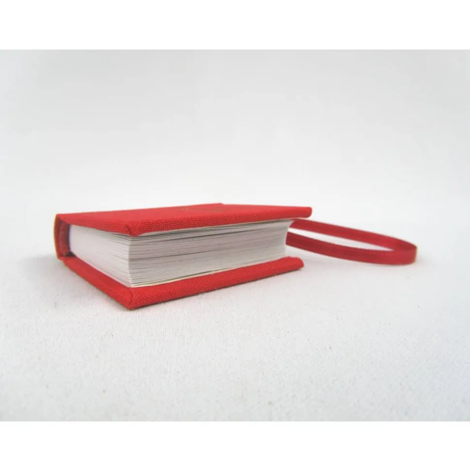 Das handgefertigte Minibuch ist in hellrotes Mattgewebe eingebunden. Dieses Buchleinen ist unbeschichtet und hat eine stoffige Oberfläche und sieht edel aus.