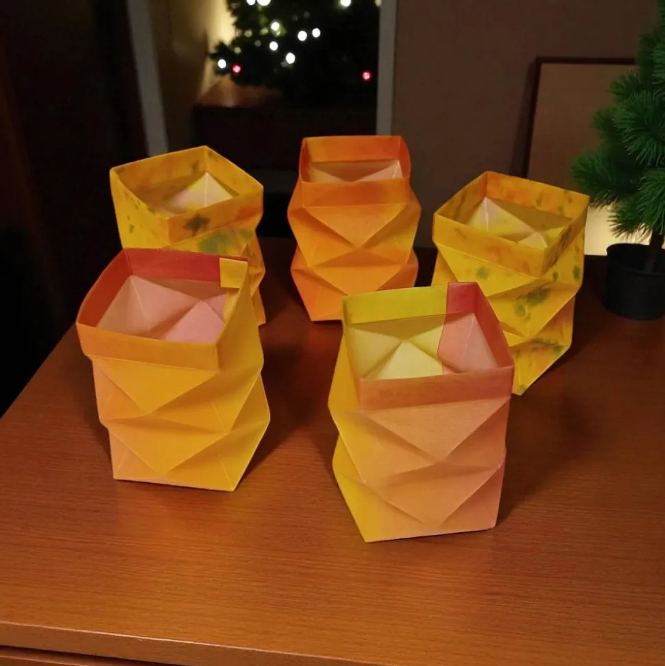 Die Laternen werden aus hochwertigem Aquarellpapier gefertigt und mit Farben von Stockmar in der Nass-in-nass-Technik bemalt. Das Papier wird zugeschnitten, gefaltet, gefalzt, geklebt und in Form gedrückt, damit jede Laterne ein Unikat ist. Nach den Trocknungsphasen wird das Papier geölt, wodurch es besonders durchscheinend und stimmungsvoll wie Transparentpapier wirkt.
