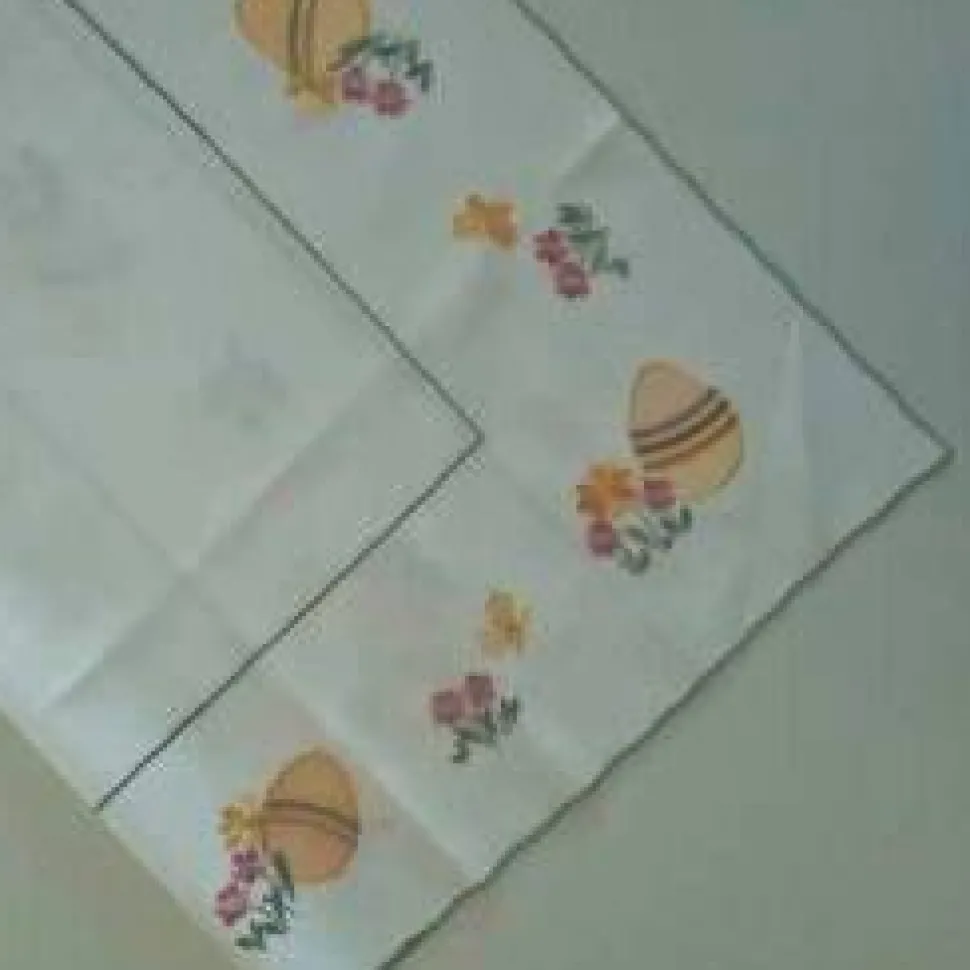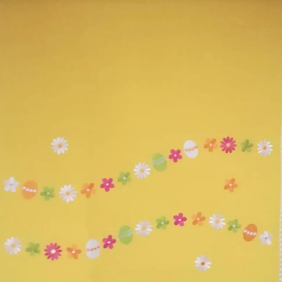 Die Decke ist ein Blickfang auf Ihrem Ostertisch. Sie besticht durch ihre intensive, gelbe Farbe und der schönen Seidenstickerei mit kleinen bunten Blümchen und Ostereier in zarten Frühlingsfarben.