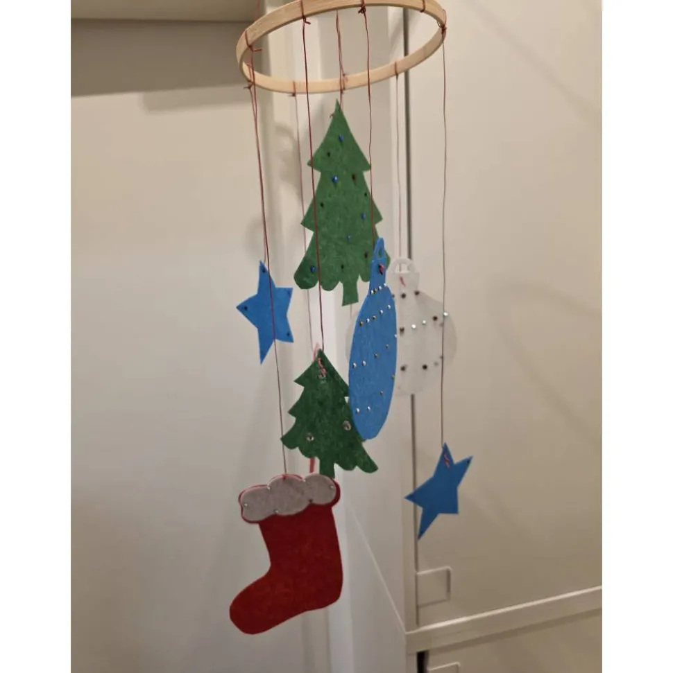 Diese Mobile ist ein Meisterwerk der Handarbeit und Kreativität. Die einzelnen Elemente wurden sorgfältig aus Filz geschnitten – jede Form entstand mithilfe einer liebevoll gestalteten Papierschablone. die aus Vorlage diente. Die doppelseitige Verzierung mit kleinen Steinen verleiht jedem Teil einen Hauch von Eleganz und Glanz, sodass das Mobile bei jeder Bewegung sanft das Licht einfängt und reflektiert.