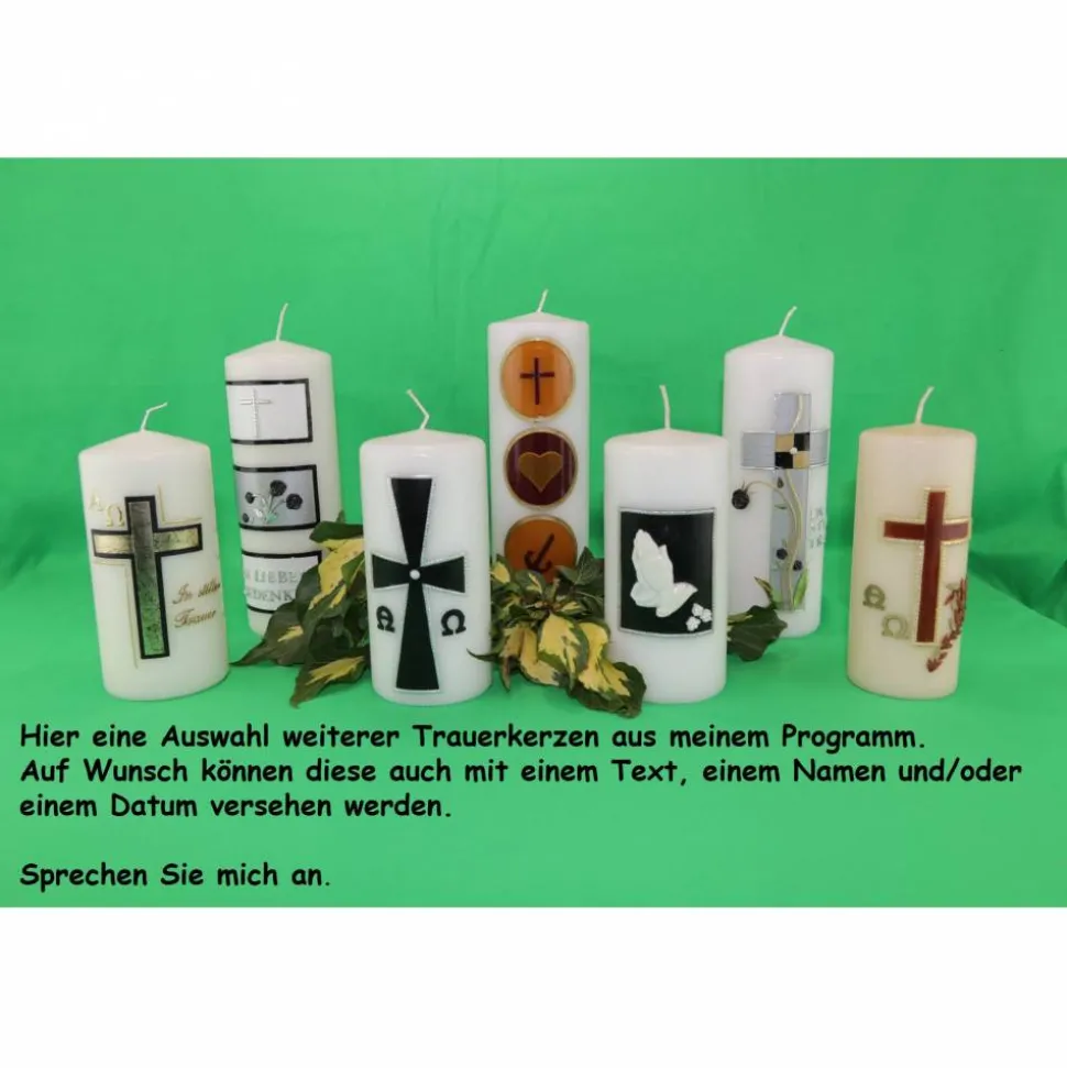 Alle Ornamente und Buchstaben auf der Trauerkerze werden einzeln von Hand aus verschiedenen Wachsplatten ausgeschnitten und kunstvoll auf der Kerze arrangiert. Dies macht jede Gedenkkerze zu einem persönlichen Unikat und einem besonderen Andenken an den Verstorbenen.