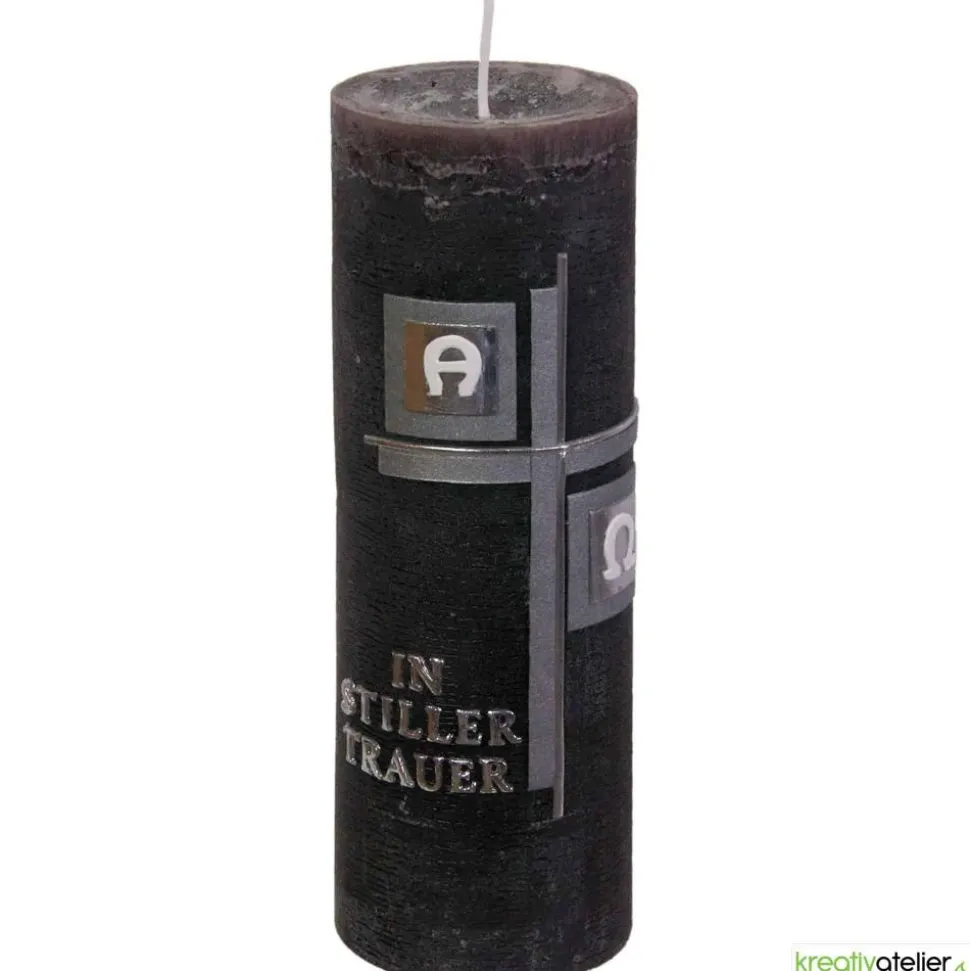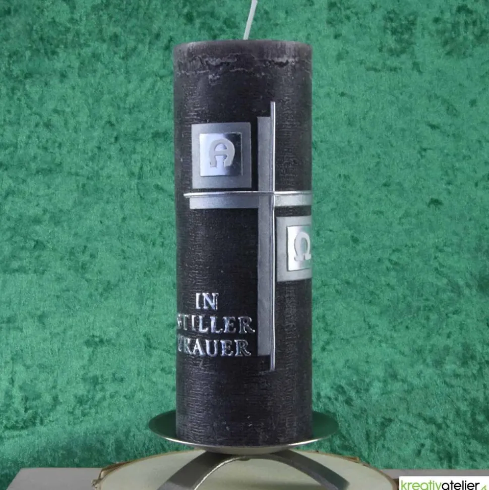 Das Zentrum der Kerze bildet das mattsilberne Kreuz, welches von einem dezenten Silberstreifen umgeben ist. Die Kacheln auf der Kerze sind ebenfalls silbern und tragen das weiße Alpha/Omega, was das Symbol für Anfang und Ende darstellt. Darunter ist der Spruch „In stiller Trauer“ in silbernen Echtwachsbuchstaben zu lesen. Hier ist auch ausreichend Platz für einen Namen des Verstorbenen. Rechts davon können der Geburts- und Todestag angebracht werden.