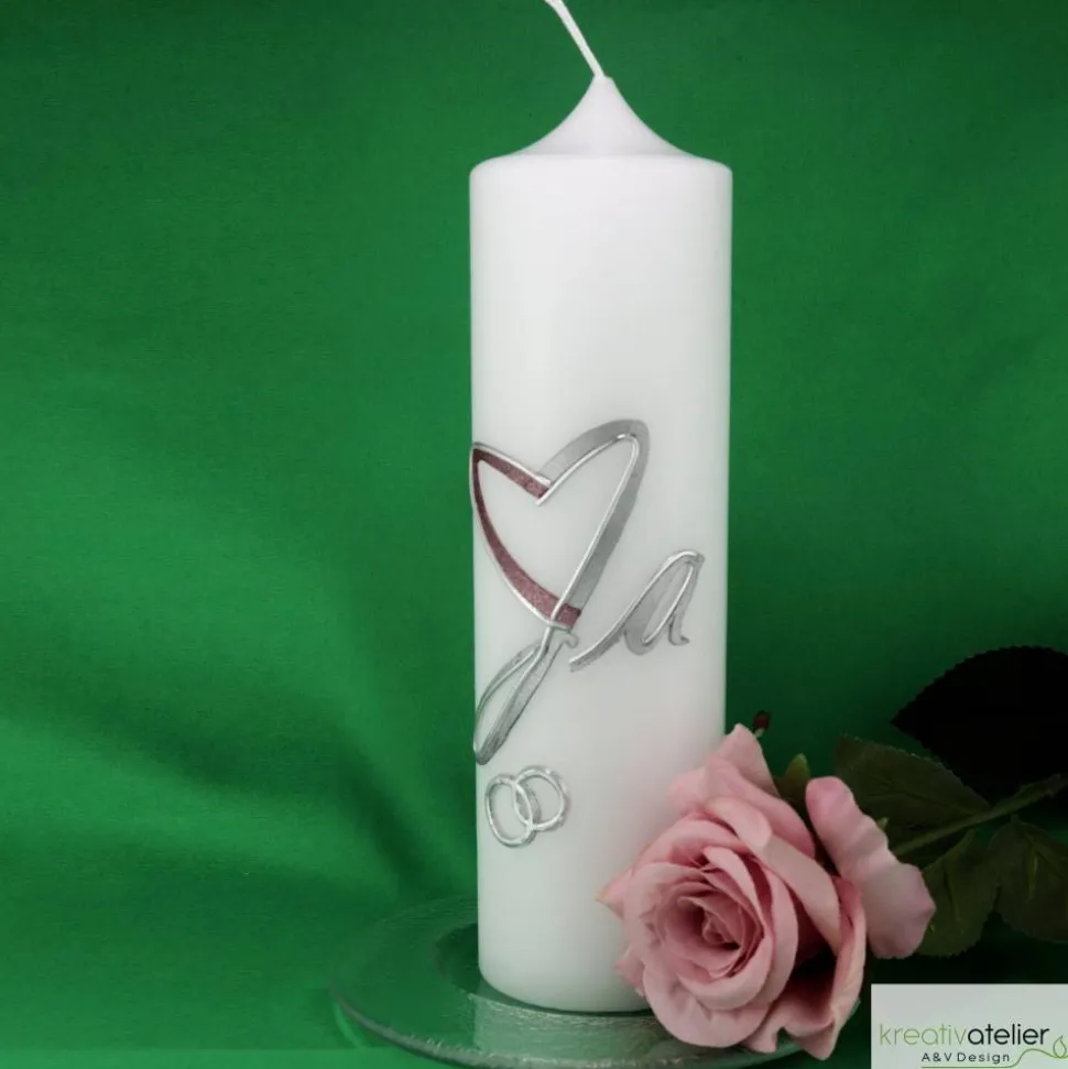 Modern und schlicht von Hand verzierte weiße Hochzeitskerze mit silbernen Wachsverzierungen. Der Schriftzug „Ja“ bildet die Basis für diese Verzierungen. Das sonst zur linken Seite offene „J“ wurde hier durch einen entgegengesetzt verlaufenden Bogen zu einem Herz modelliert. Der eher schlicht wirkende Schriftzug in mattsilber wird durch den farblichen Streifen in einem dunklen Rosa oder einem Grün am linken Herzrand aufgefrischt. Auch der dezent verlaufende Silberstreifen entlang des Schriftzugs verleiht der Hochzeitskerze etwas Edles.