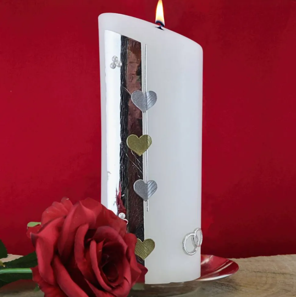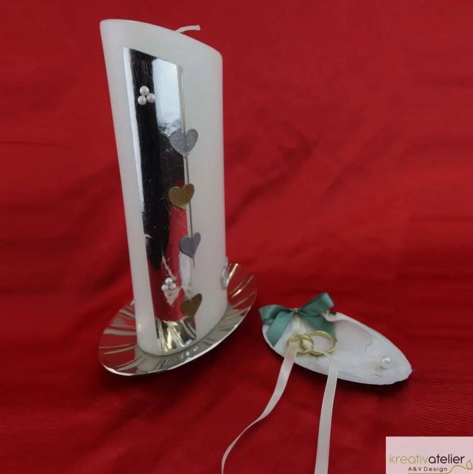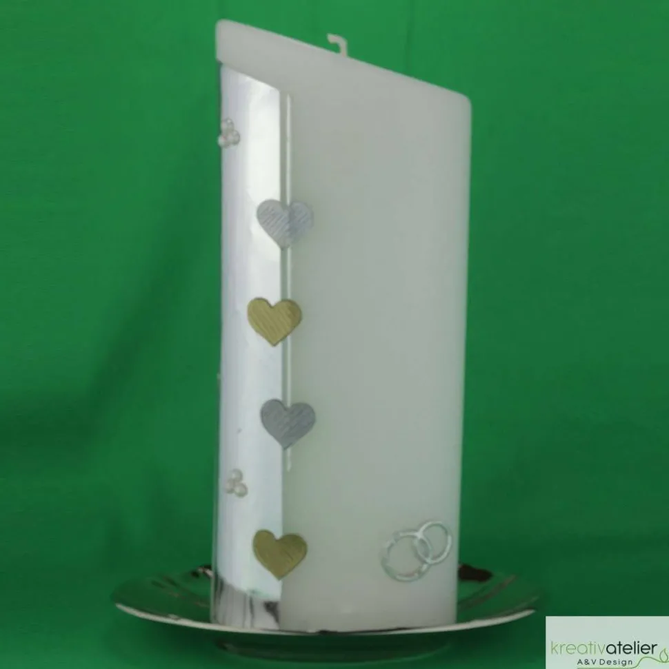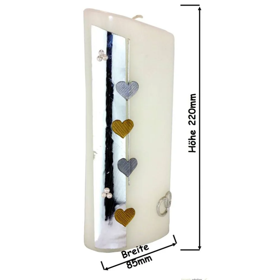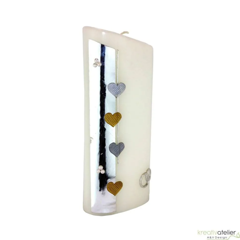 Die Basis der Verzierung bildet ein silberner Wachsstreifen an der linken Seite der Kerze. Dieser Streifen ist mit silbernen und goldenen Herzen sowie kleinen Halbperlen verziert, was der Kerze eine romantische und luxuriöse Note verleiht. Alle Ornamente werden einzeln von Hand aus verschiedenen Wachsplatten ausgeschnitten und liebevoll zu einem harmonischen Bild auf der Kerze arrangiert.